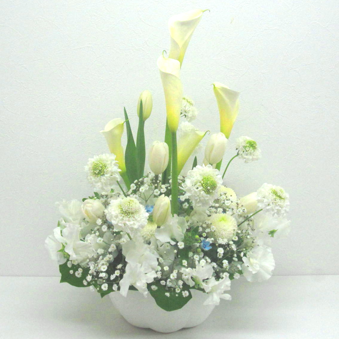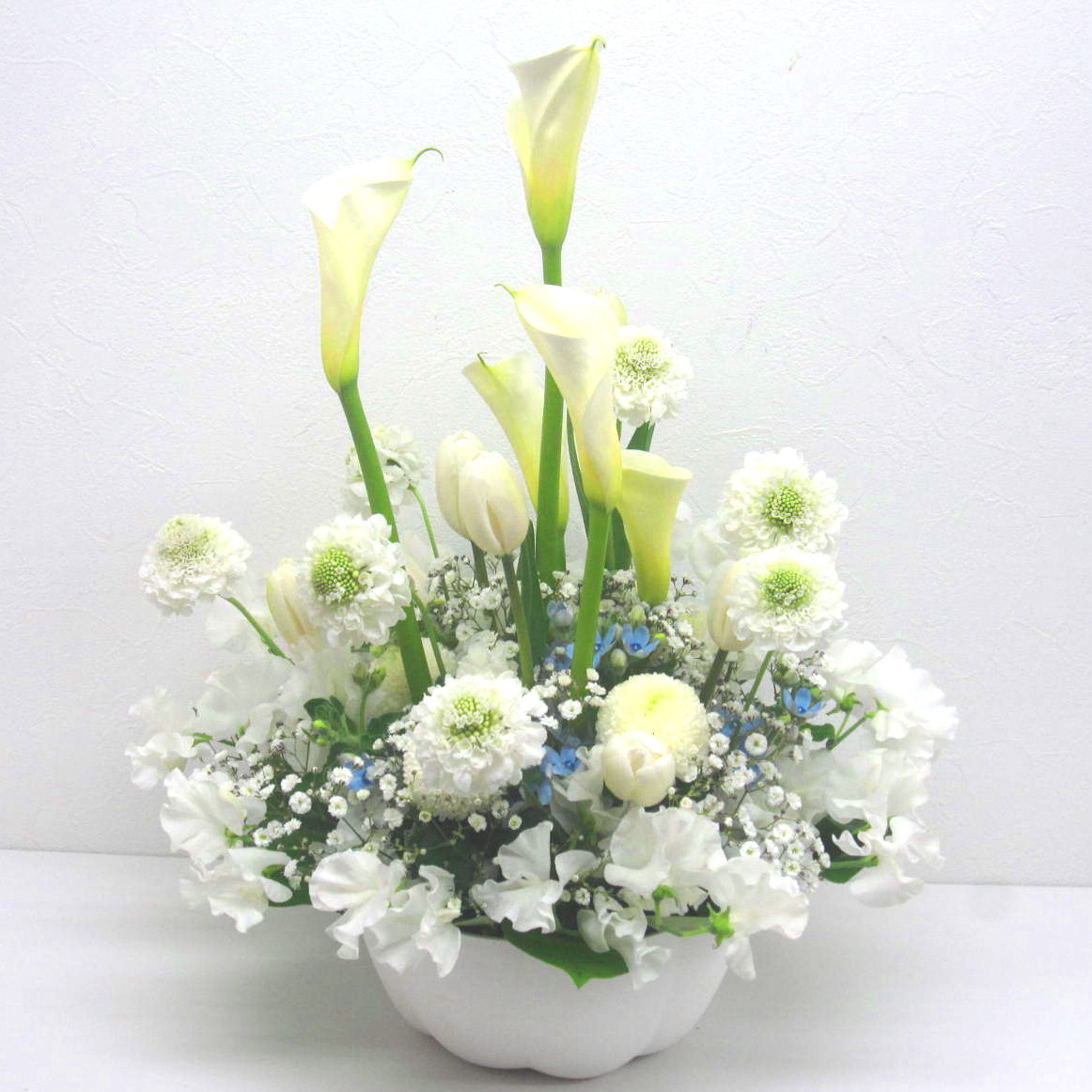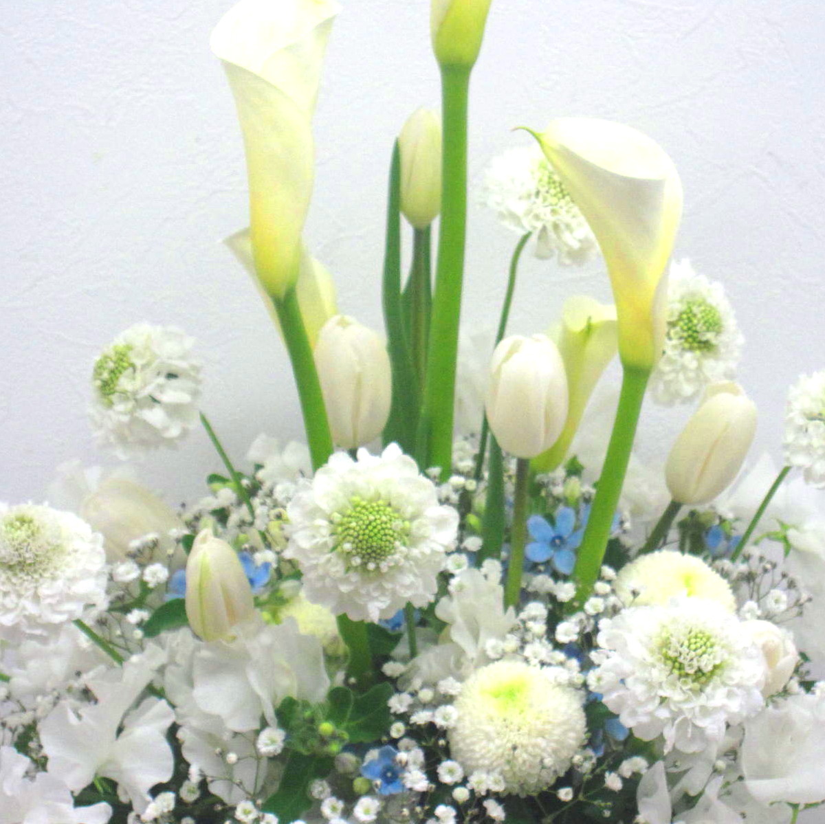 あの人を偲んで…。白上がりの御供え用アレンジメントです。チューリップやスイートピーなど春のお花を入れて上品にお作りします。また、その日、市場から入荷した鮮度の良いお花でお作りしますので花持ちが良く、ご利用いただいたお客様から「大変花持ちが良い」と高い評価をいただいております。目を閉じて心の中にいる故人への想いをそっと呼び起こします。当店では、お客様のその想いをしっかりと受け止め、心を込めて制作致します。静岡県から全国へお届けします。春の故人を偲ぶ色々なシーンで是非、ご利用下さい。