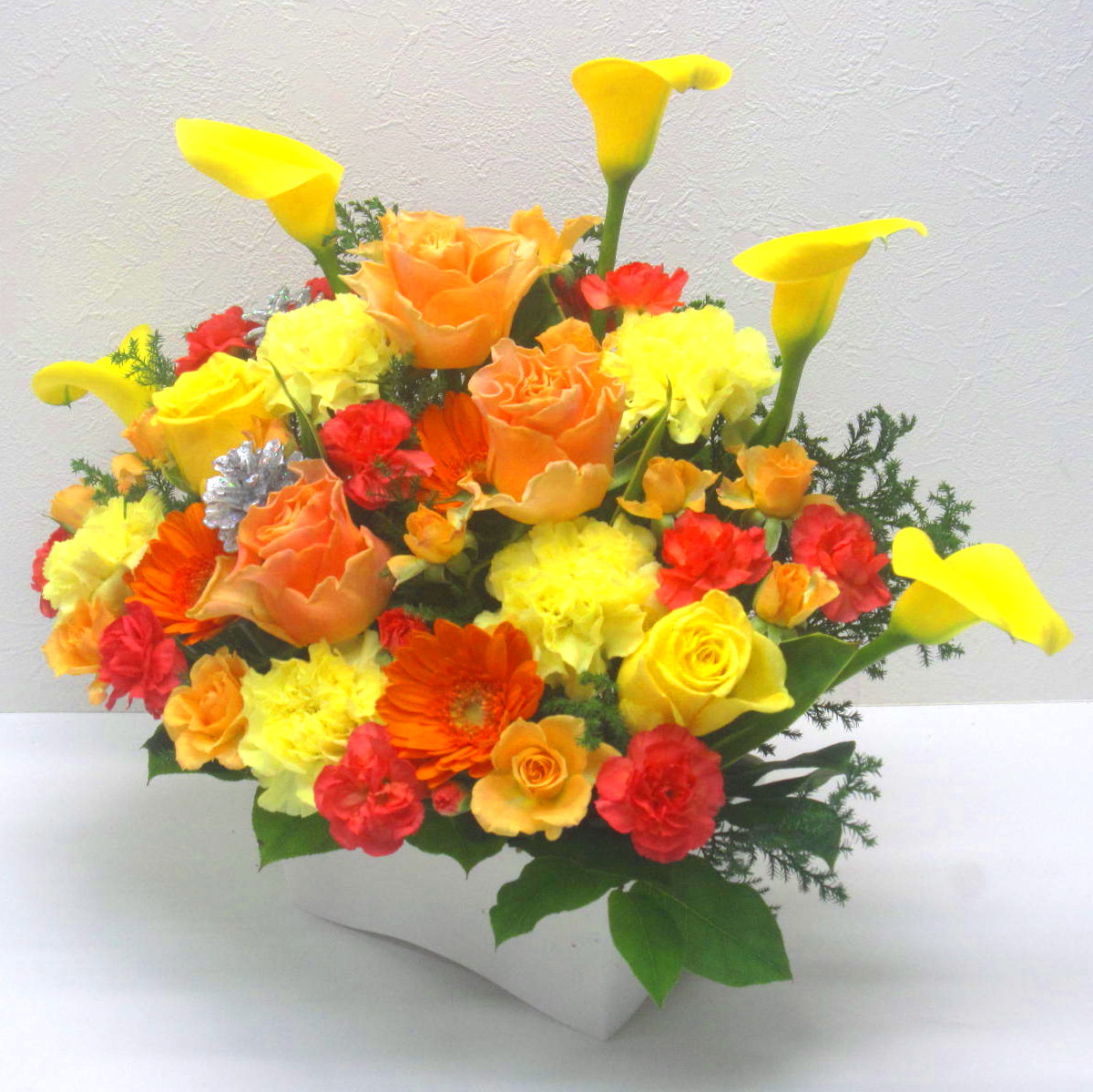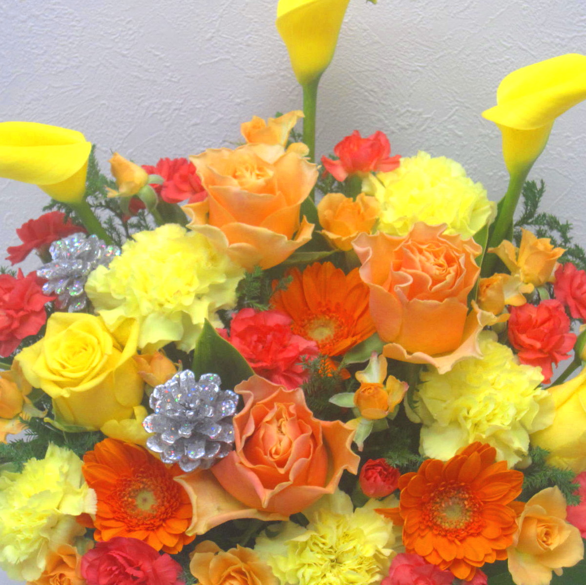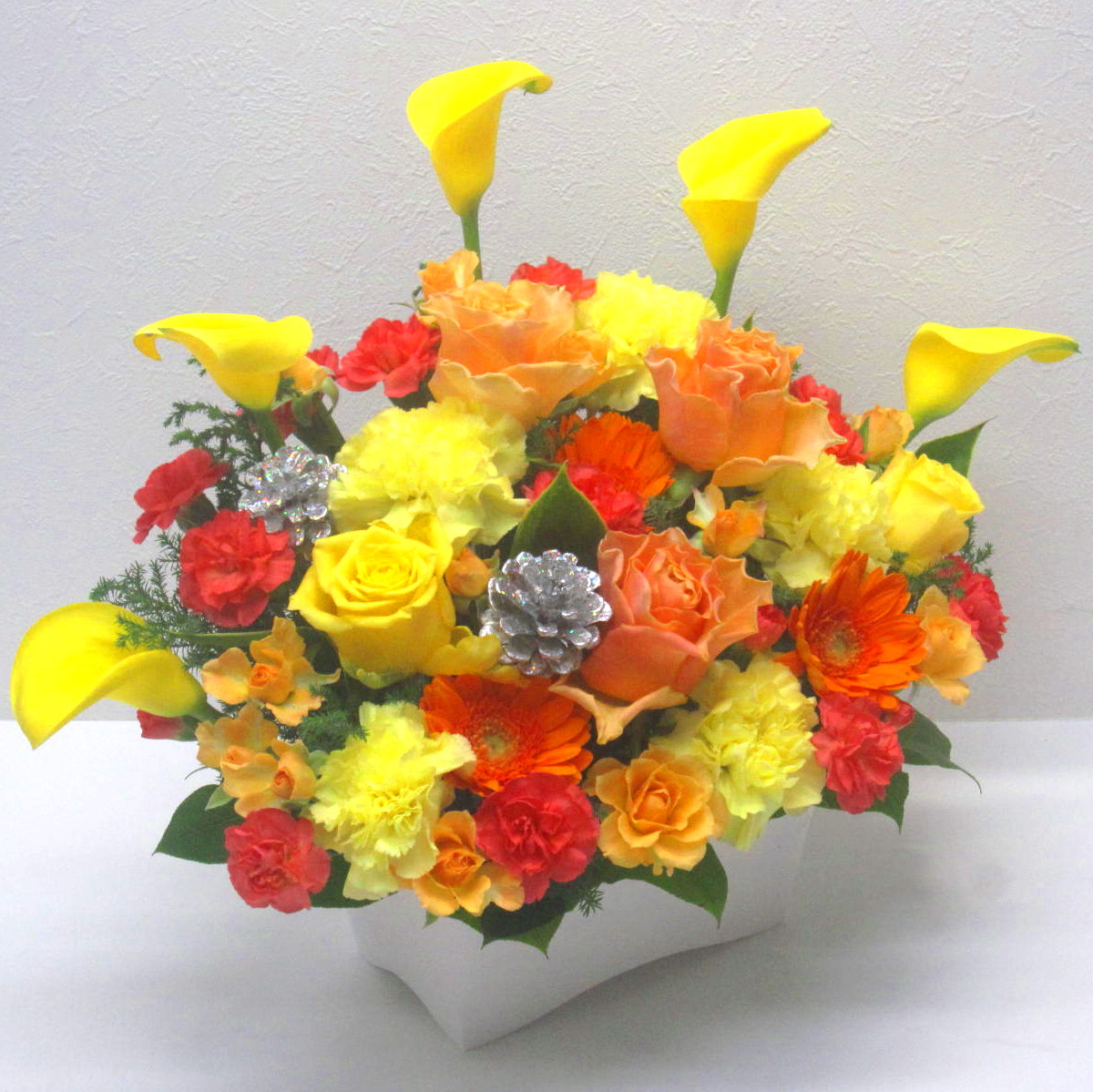 花材: メイン カラー、バラ、ガーベラ、カーネーション、シルバーラメ松かさなど その他 葉物類など