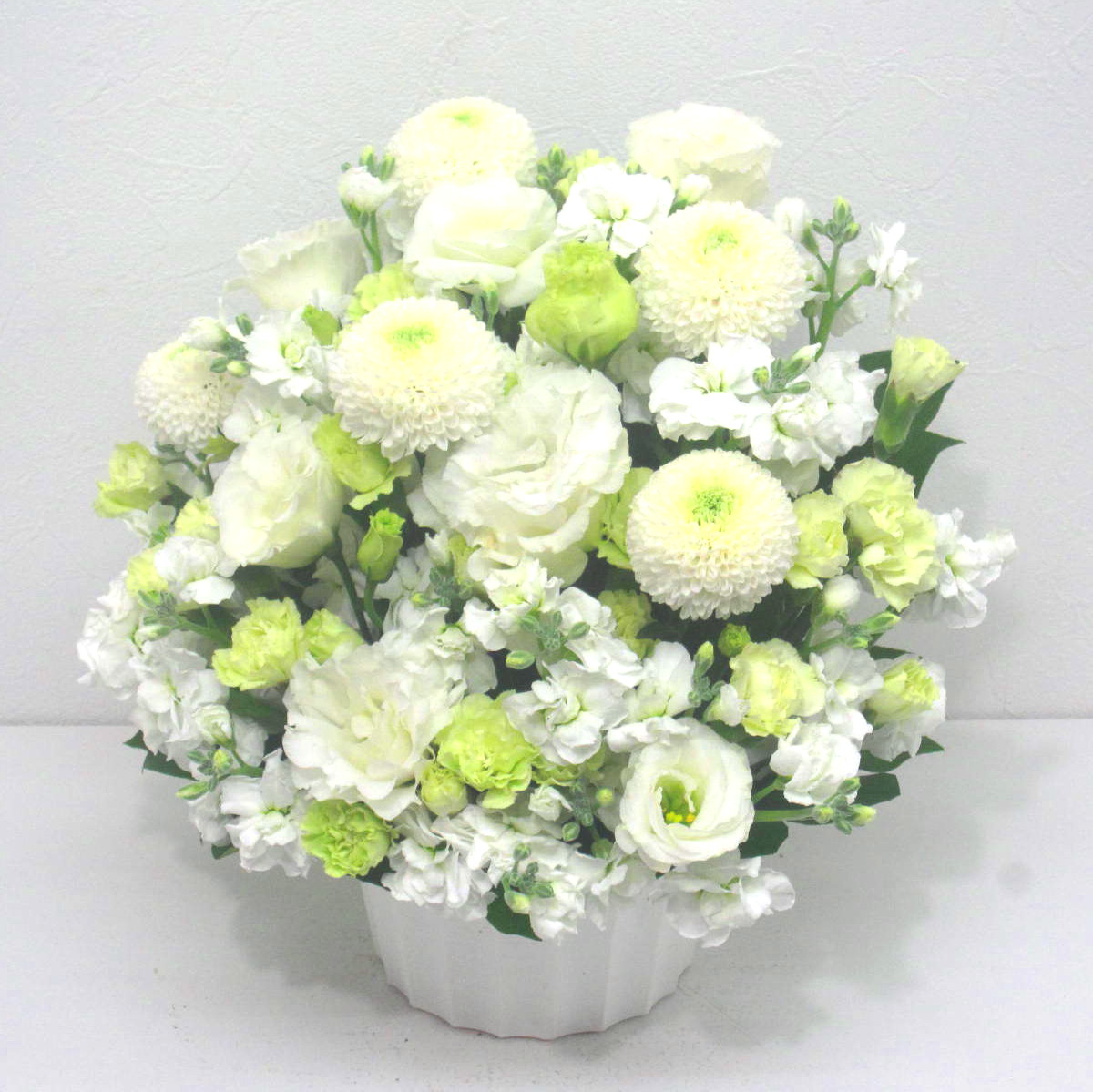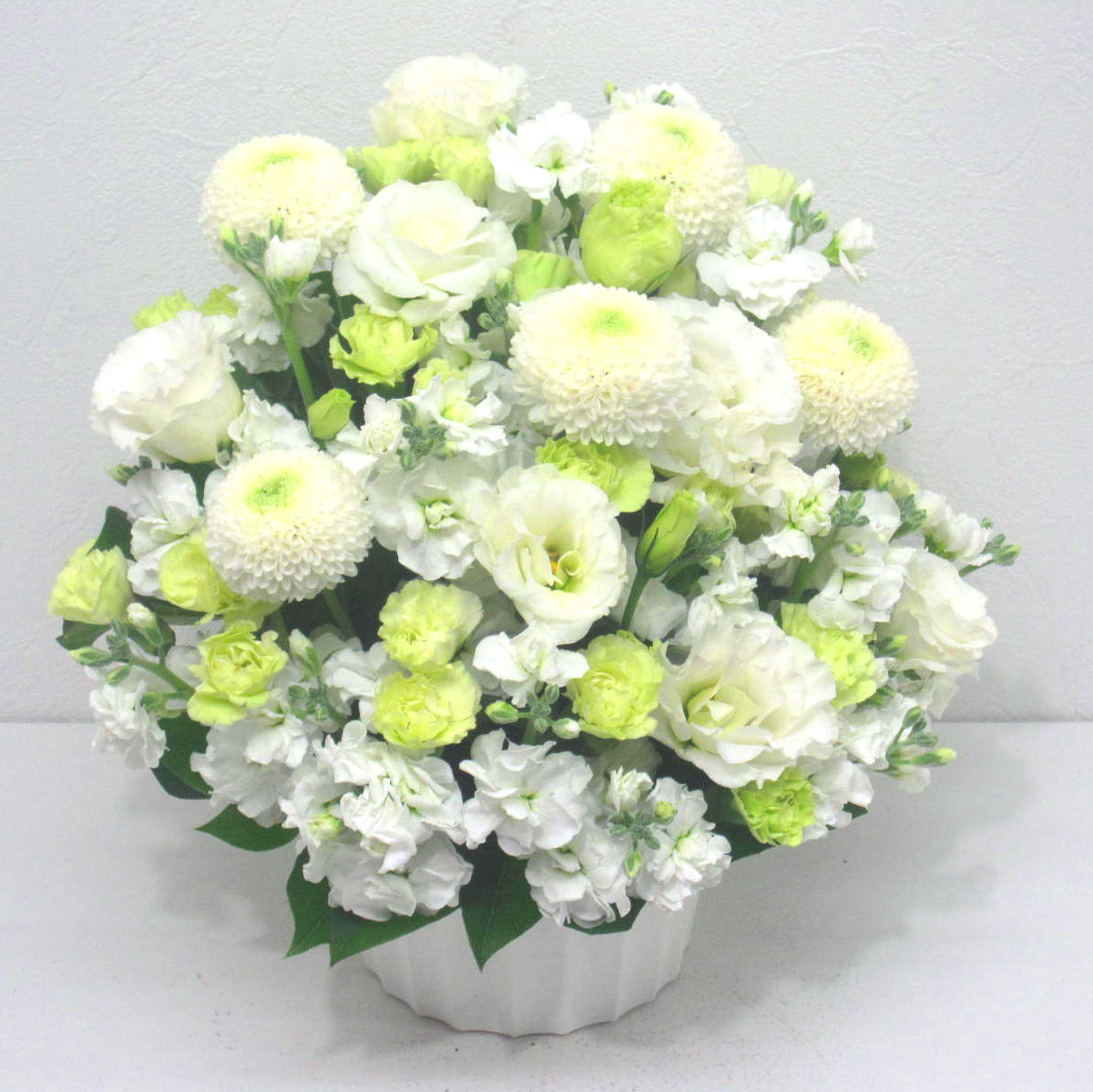 春のお花「SPストック」を入れて白いまあるいお花「ピンポンマム」を主体とした可愛らしいアレンジメント。また、その日、市場から入荷した鮮度の良いお花でお作りしますので花持ちが良く、ご利用いただいたお客様から「大変花持ちが良い」と高い評価をいただいております。目を閉じて心の中にいる故人への想いをそっと呼び起こします。当店では、お客様のその想いをしっかりと受け止め、心を込めて制作致します。静岡県から全国へお届けします。春の故人を偲ぶ色々なシーンで是非、ご利用下さい。
