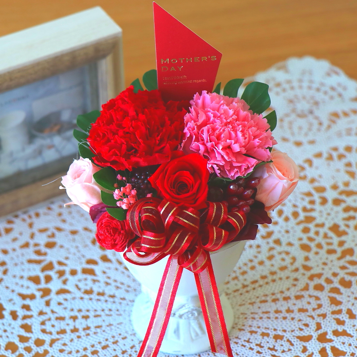 《今年の母の日は2025年5月11日(日)》バラの模様が入った白い器がとっても素敵です!カーネーションとバラのピンク&レッド系のプリザーブドフラワー。母の日のプレゼントにオススメです。【15時迄のご注文で翌日届きます】※こちらの商品についてのご相談、ご質問等ございましたら(メール)または(お電話)にて承ります。