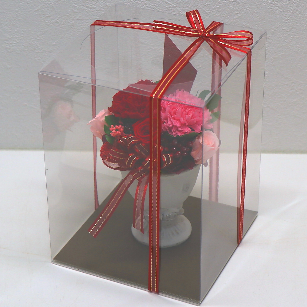 カーネーションのプリザーブドフラワーを中心に、ピンクの淡い色のプリザーブドローズを使用した母の日にピッタリなプリザーブドフラワーです。バラの模様の入った器がプリザーブドフラワーとマッチしていてとても素敵な雰囲気ですよ。しかもクリアケース付きなのでお部屋のインテリアとしてもお洒落に飾れるので貰って嬉しい贈り物です。当店ではお客様の想い大切に【こころを込めて】お作りいたします。静岡県駿東郡長泉町から日本全国へお届けします。是非、母の日の想いを込めたフラワーギフトにいかがですか!?※プリザーブドフラワーとは、生花に特殊加工を施した、長期間楽しめるお花です。【クリアケース時サイズ:高さ20cm×幅15cm×奥行15cm】