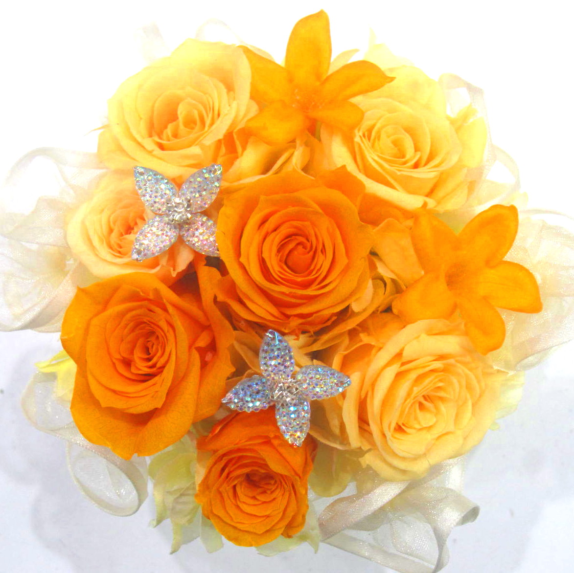 フリフリとしたリボンがアクセントの素敵なプリザーブドフラワー。キラキラと光るジュエルピックも添えた上品な雰囲気も良いですよ~。黄色&オレンジ系の色彩なのでいつも活発で明るい方への贈り物や元気を出してほしい方への贈り物にオススメです。【15時迄のご注文で翌日届きます】※こちらの商品についてのご相談、ご質問等ございましたら(メール)または(お電話)にて承ります。