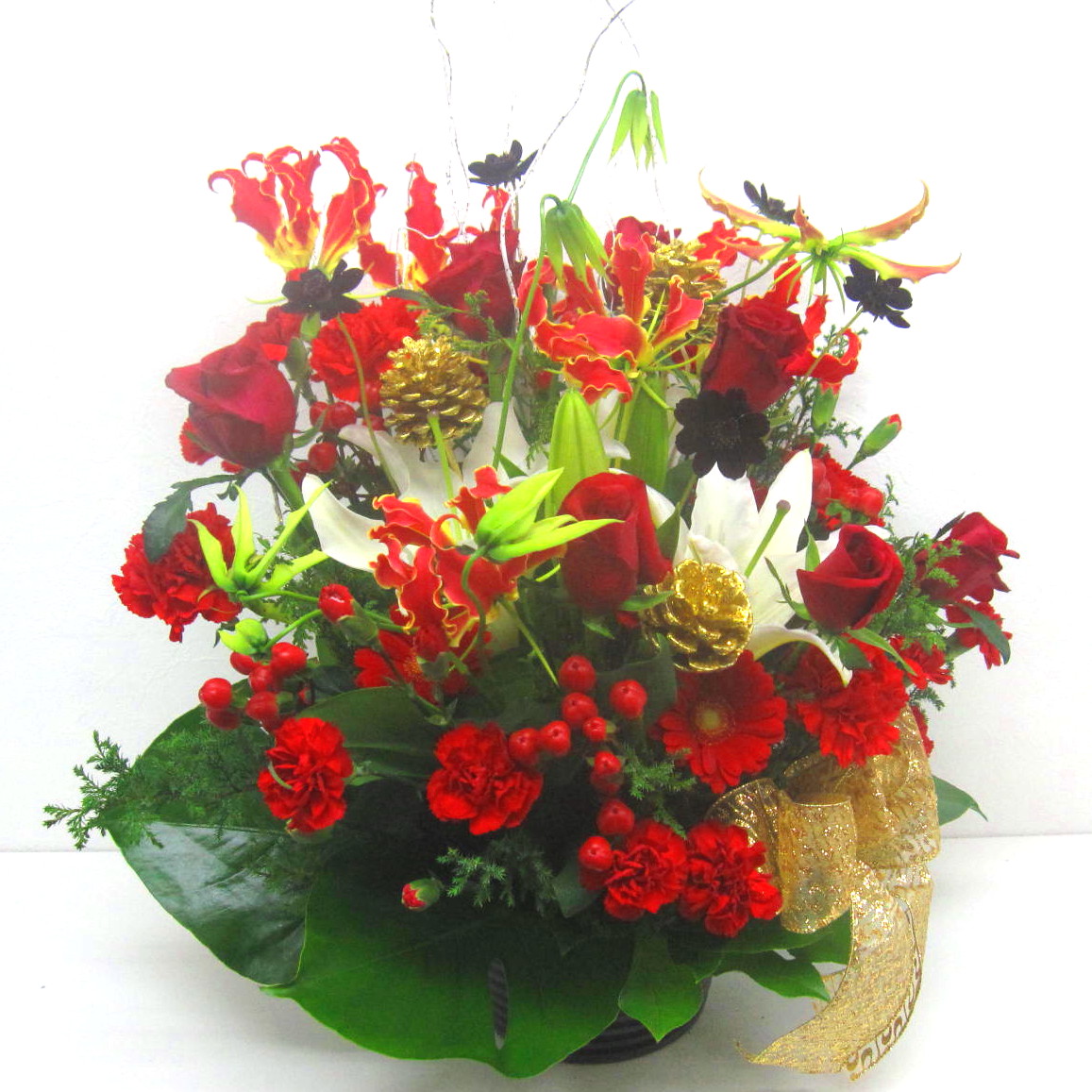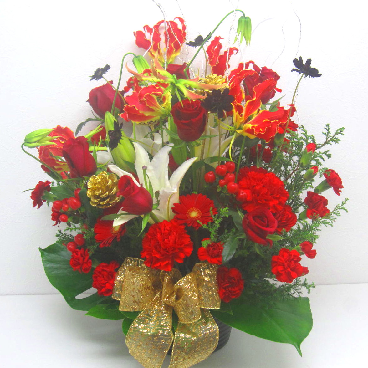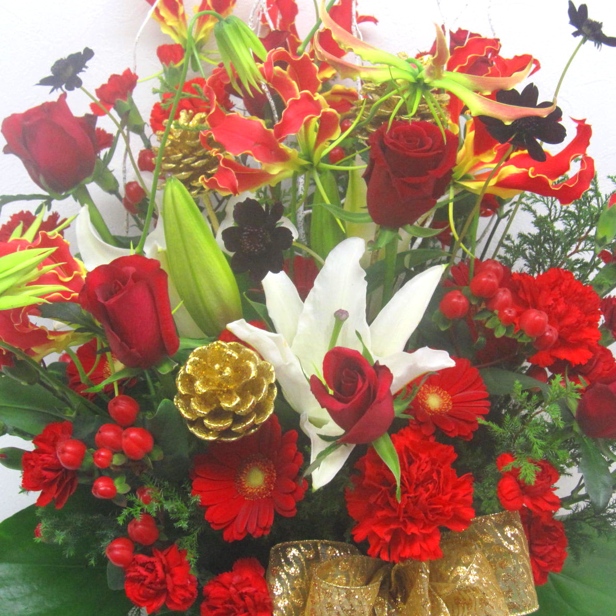 花材: メイン ユリ、バラ、ガーベラ、カーネーション、ゴールド松かさなど その他 シロヌリ(ラメ付)、ヒムロスギ、葉物類など