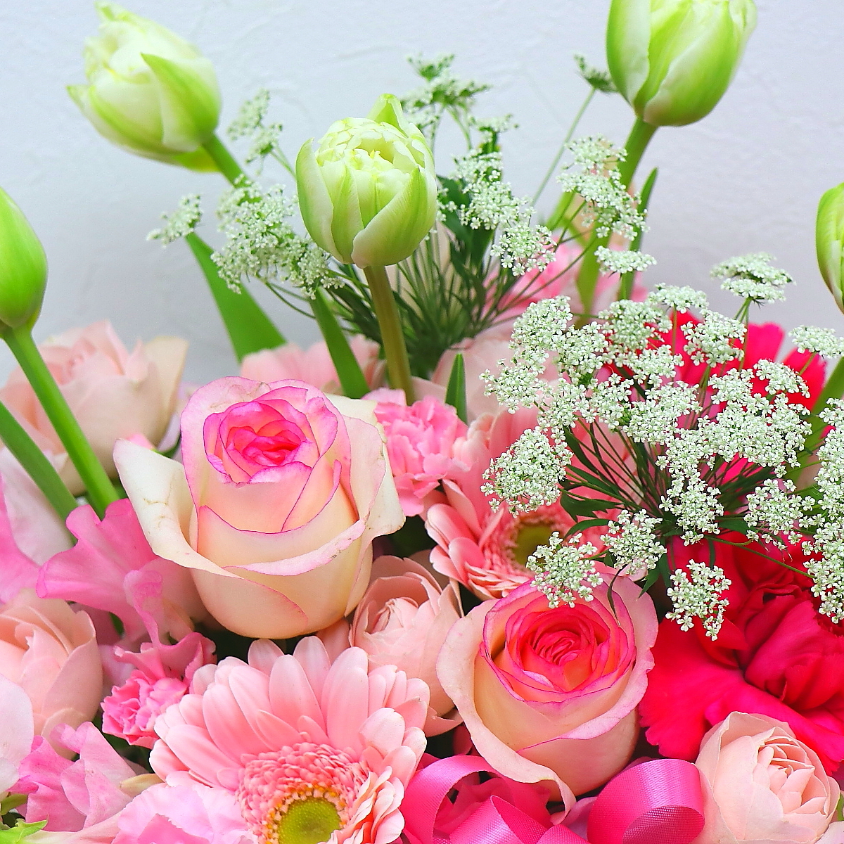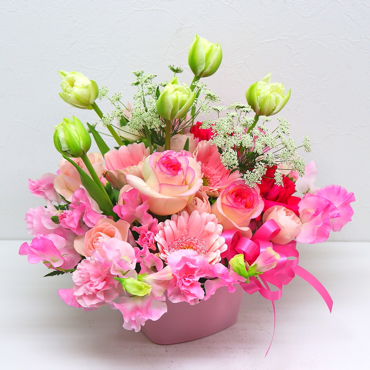 花材: メイン チューリップ、スイートピー、バラ、ガーベラ、カーネーションなど その他 季節のお花、葉物類など