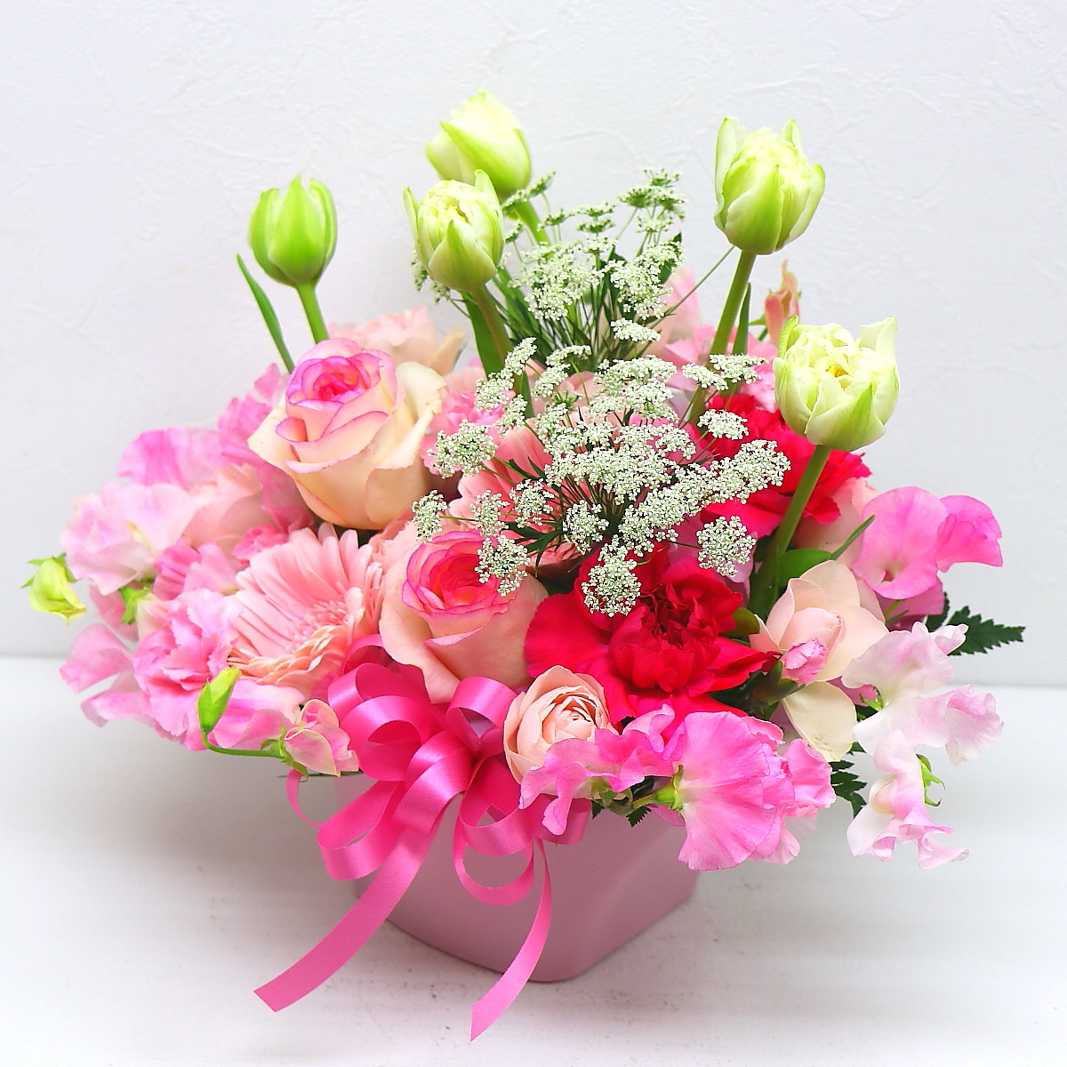 春のお花「チューリップ」と「スイートピー」を入れたピンク系のアレンジメント。優しい雰囲気の色合いがとっても綺麗で素敵ですよ。【15時迄のご注文で翌日届きます】※こちらの商品についてのご相談、ご質問等ございましたら(メール)または(お電話)にて承ります。