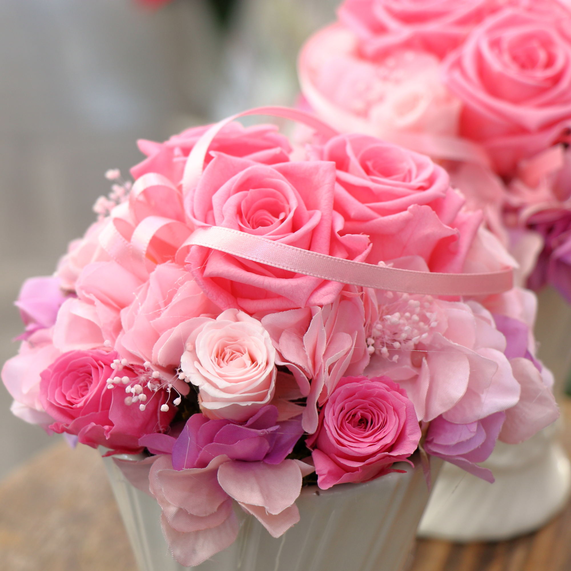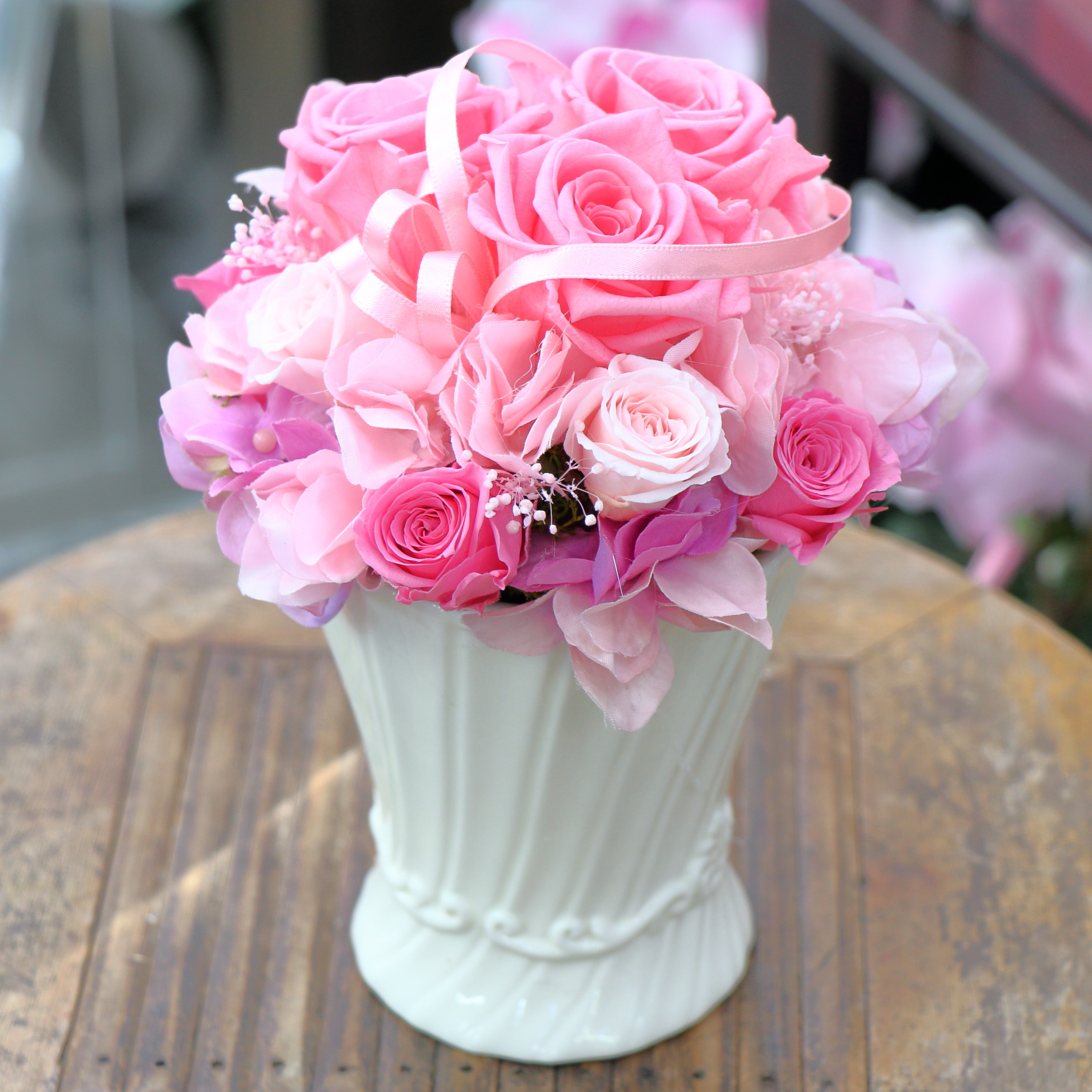 ピンクの優しい色彩でまとめたプリザーブドフラワー。ピンクのグラデーションが優しく包み込んでくれそうな雰囲気です。※こちらの商品についてのご相談、ご質問等ございましたら(メール)または(お電話)にて承ります。
