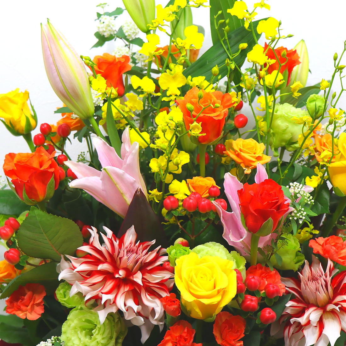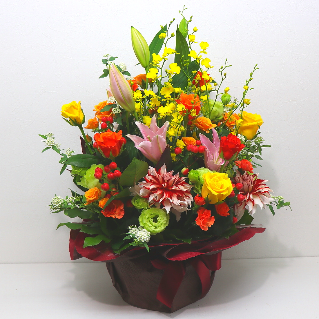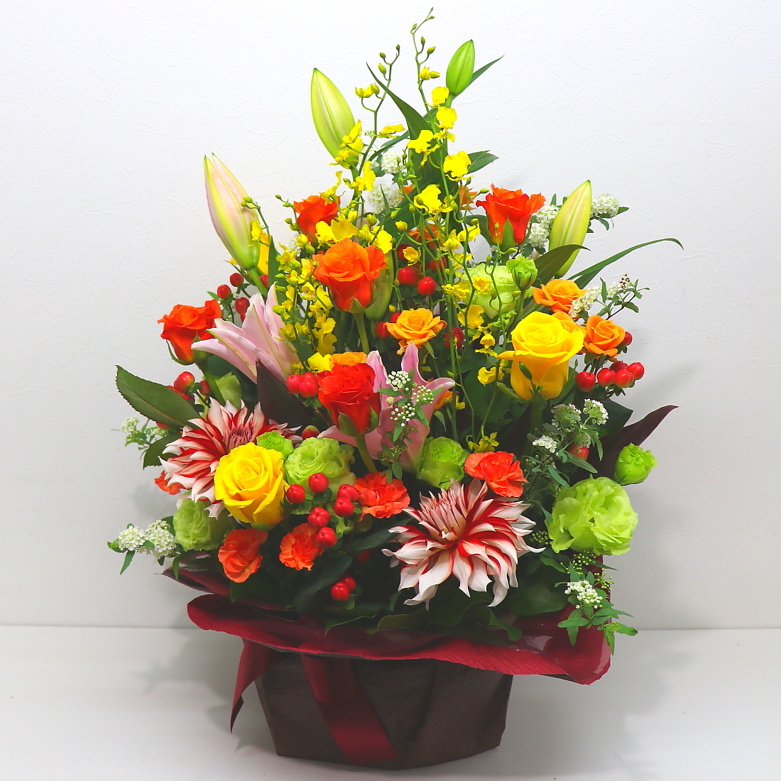 存在感のあるお花を主体ににぎやかな雰囲気で制作したアレンジメントです。アレンジメントの底の部分も綺麗にラッピングしてお祝いにふさわしくお包み致します。また、ご利用されたお客様から「大変花持ちが良い」と好評をいただいております。静岡県長泉町から日本全国【真心】込めてお届けいたします。さまざまなご用途に贈る贈り物としてオススメです。大切な方へ贈るフラワーギフトやプレゼントなら「花樹園オンラインドットコム」に是非、お任せ下さいませ。