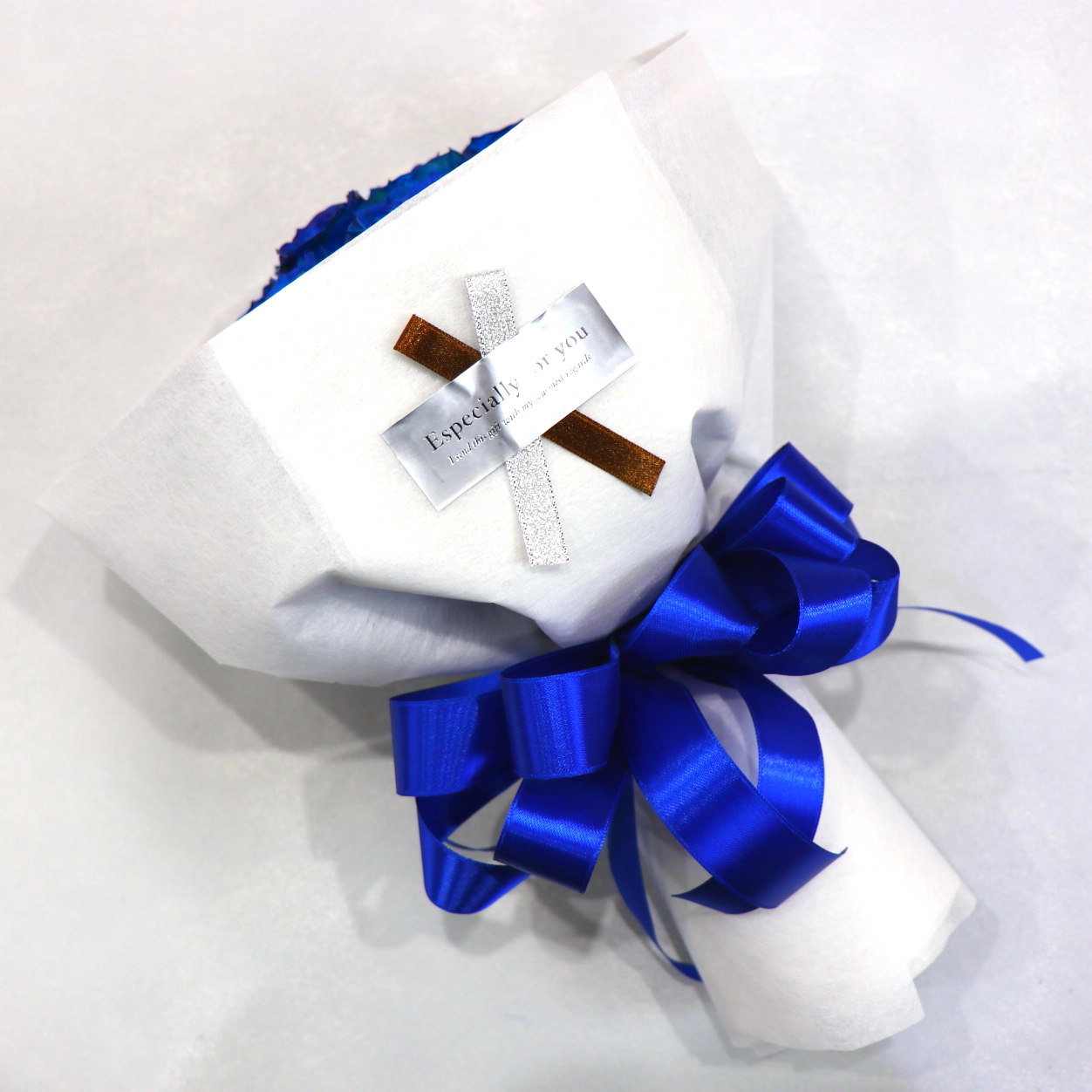 私達花のプロが販売する厳しい基準をクリアした白い国産バラを切花着色剤で吸い上げ青いバラ(染色)にオリジナル加工したバラの可愛らしい上品な花束です。茎も太く、花も大きく咲きます。もちろん花持ちにも自信があります。ラッピングも上品な雰囲気をイメージし、ホワイト、アクセントにシルバーを入れて上品で素敵な感じにしました。ご購入されたお客様から高い評価を頂いております。静岡県長泉町から日本全国【真心】込めてお届けいたします。さまざまなご用途に贈る贈り物としてオススメです。大切な方へ贈るフラワーギフトやプレゼントなら「花樹園オンラインドットコム」に是非、お任せ下さいませ。