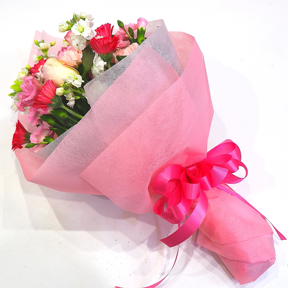ピンク系主体でまとめたボリューム感のある花束。白系のお花も少し入れているので上品さもありますよ。※こちらの商品についてのご相談、ご質問等ございましたら(メール)または(お電話)にて承ります。
