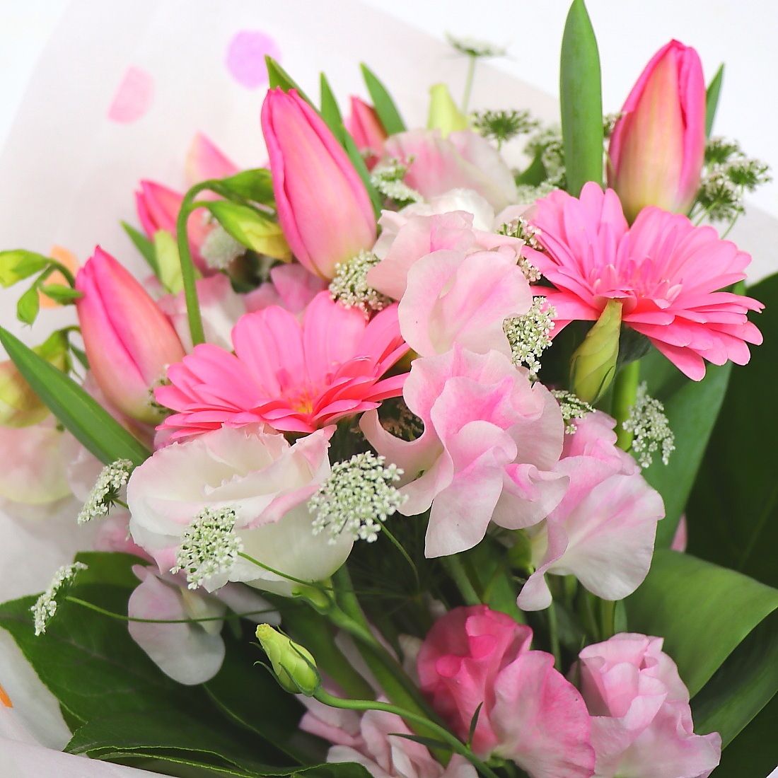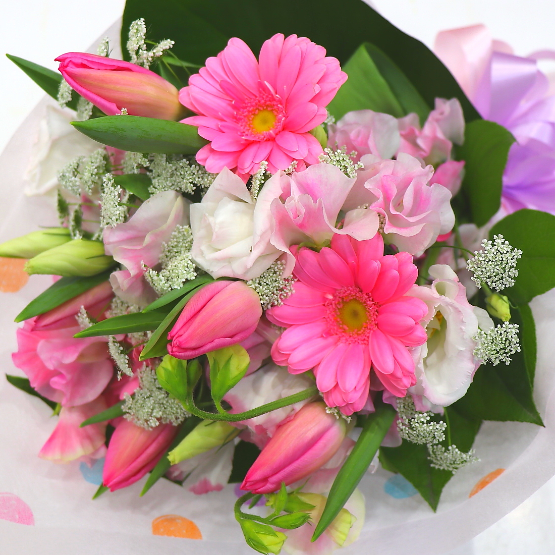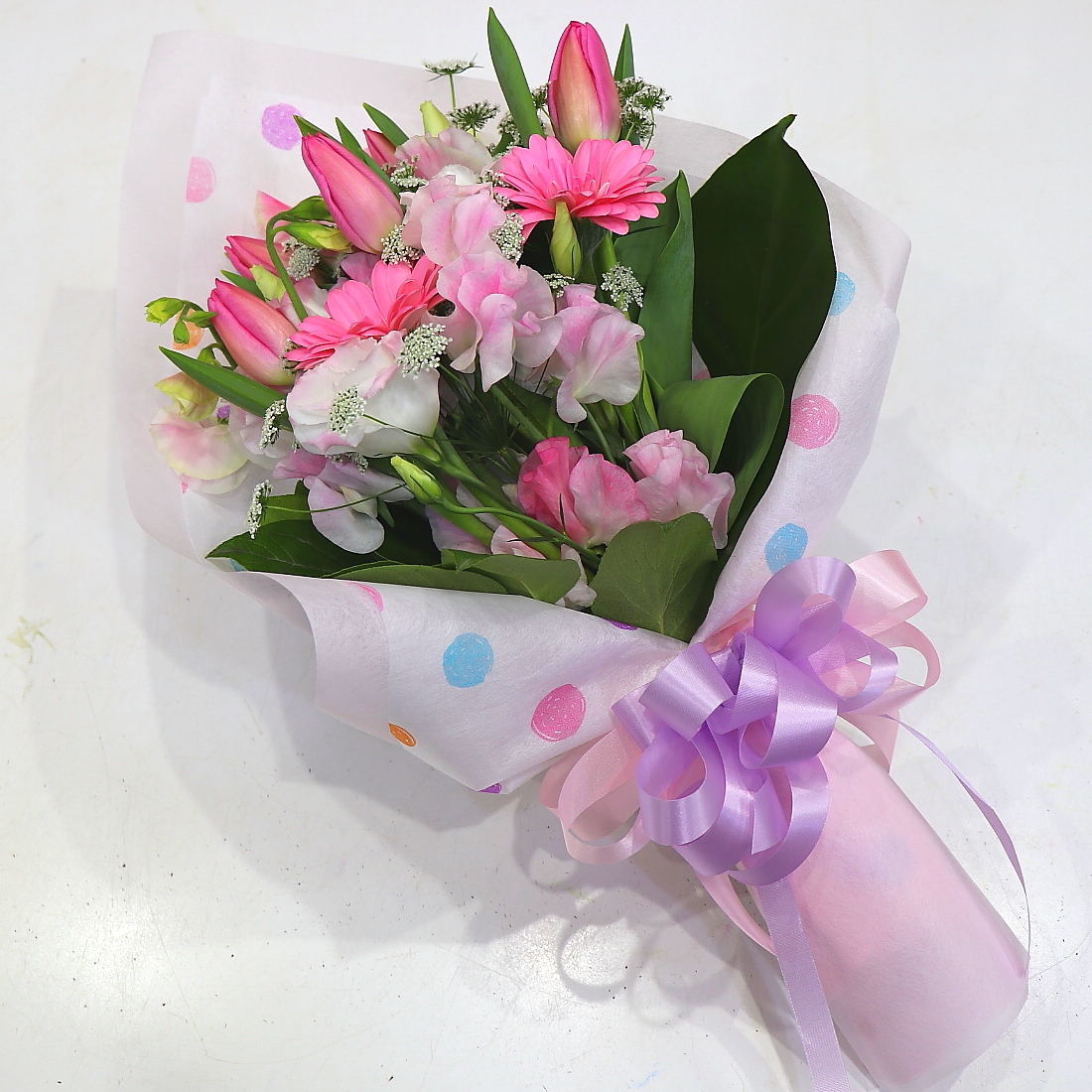 ピンクのグラデーションが可愛らしい色合いの春の花束です。色彩だけでも春らしいのに、チューリップやスイートピー、ガーベラを入れて可愛らしい雰囲気を演出。女性が喜びそうな贅沢な花束です。ラッピングも上品にお包み致します。女性へのプレゼントに喜ばれそう!また、その日、入荷した持ちの良いお花を中心に使っておりますので花持ちも良いでしょう。ご購入されたお客様から高い評価を頂いております。静岡県長泉町から日本全国【真心】込めてお届けいたします。さまざまなご用途に贈る贈り物としてオススメです。大切な方へ贈るフラワーギフトやプレゼントなら「花樹園オンラインドットコム」に是非、お任せ下さいませ。