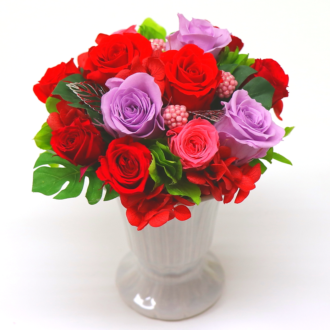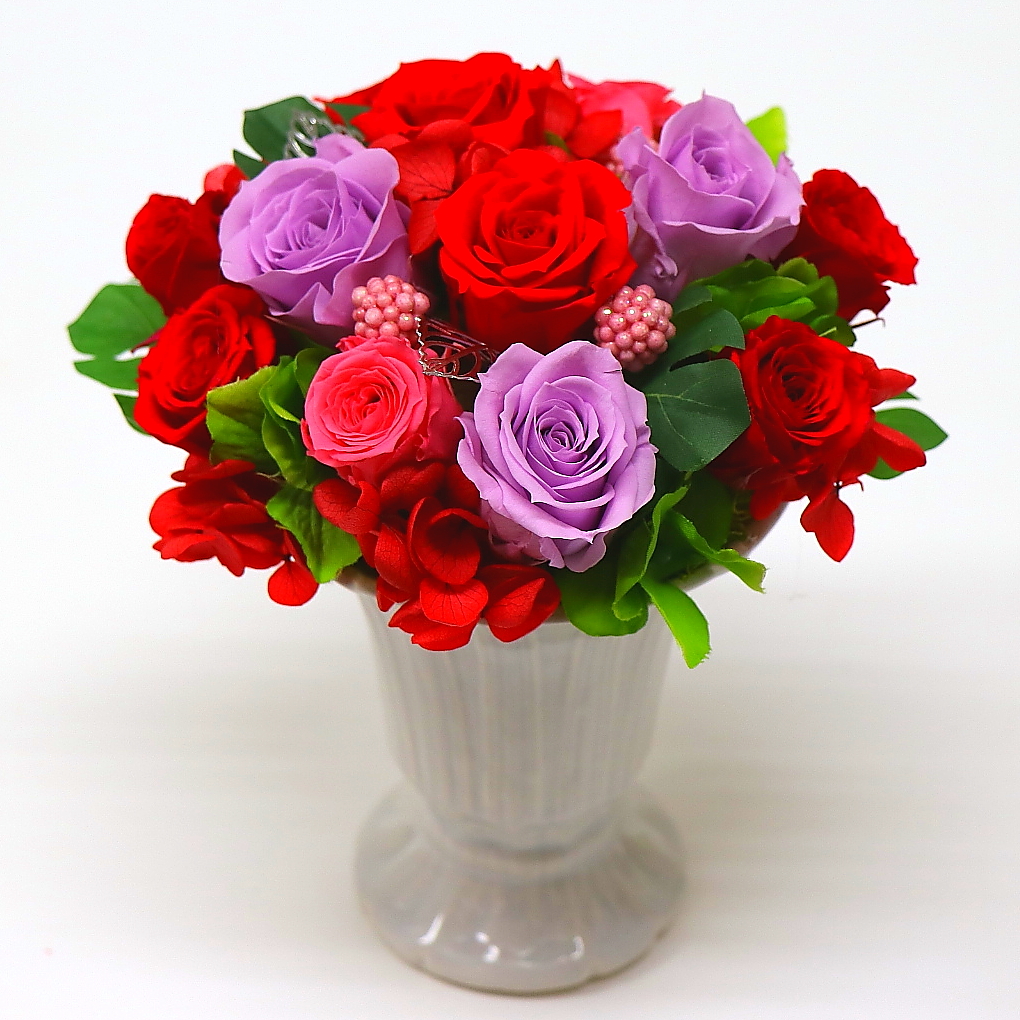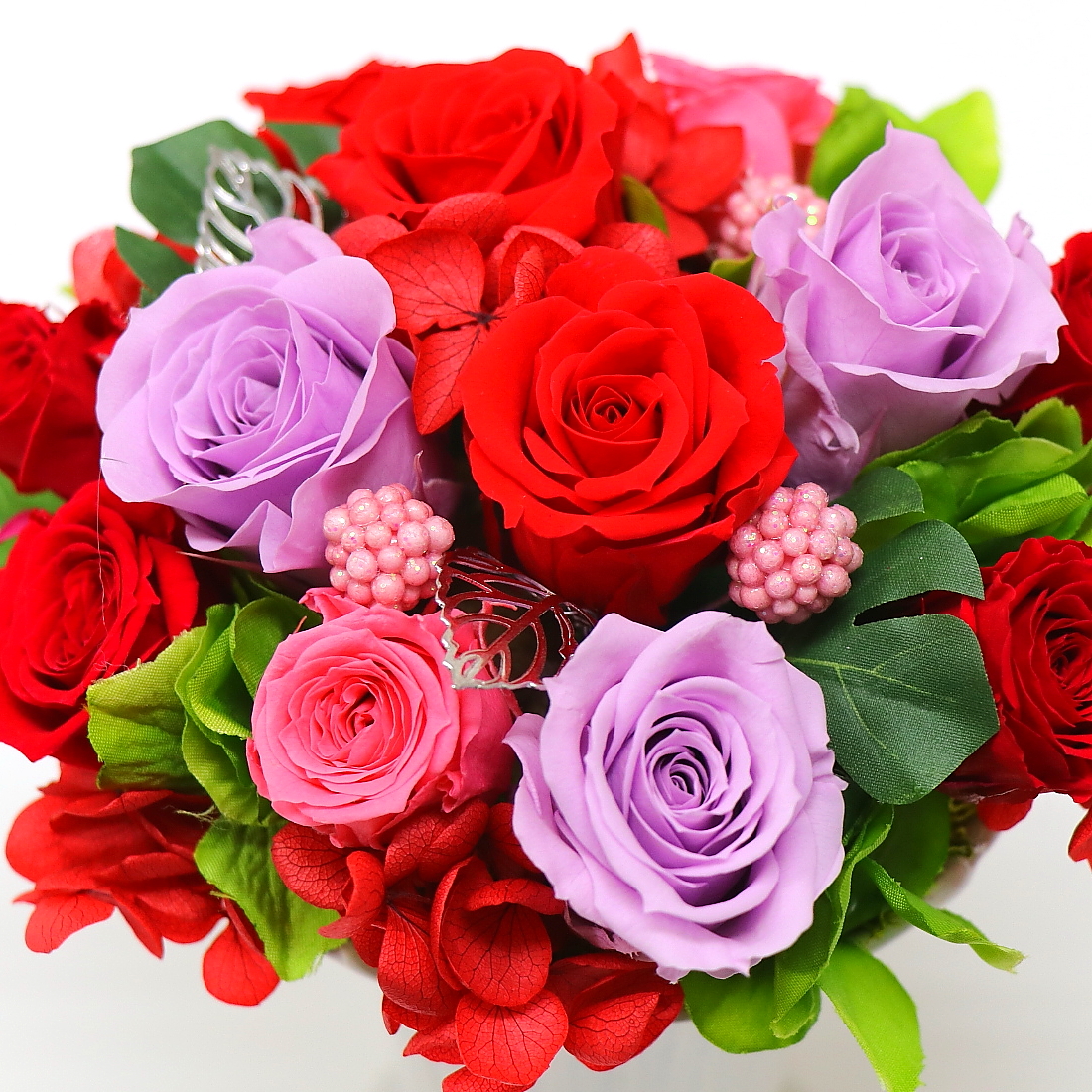 赤・紫・ピンク・グリーンなどのプリザーブドフラワーでアレンジした素敵なプリザーブドフラワーです。主にプリザーブドローズを主体に和モダンテイストの色合いでお作りします。また、ギフト用クリアケース付きなのでプレゼントにピッタリですよ。当店ではお客様の想い大切に【こころを込めて】お作りいたします。静岡県駿東郡長泉町から日本全国へお届けします。是非、想いを込めたフラワーギフトにいかがですか!?