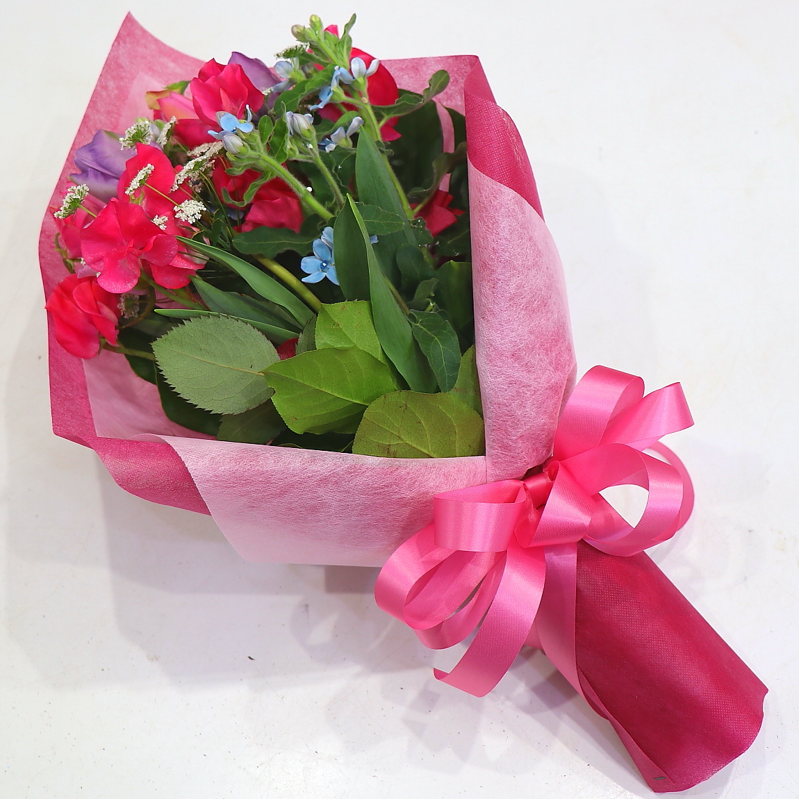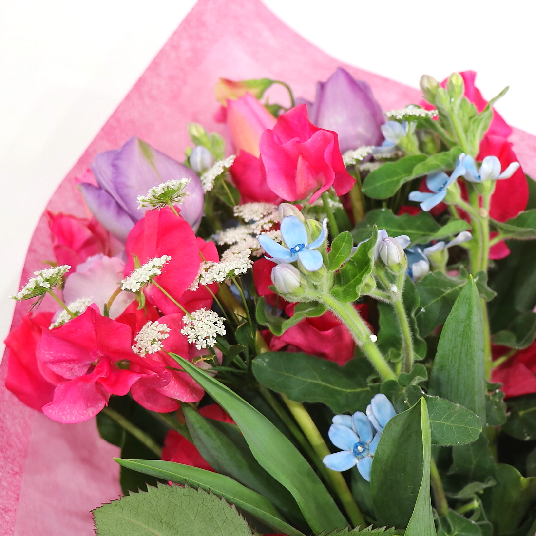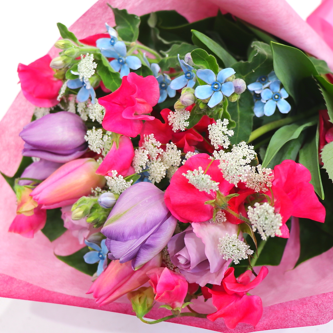 春を代表するお花「チューリップ」と「スイートピー」を入れた花束です。色合いがピンク&パープル系でさし色に淡いブルーのお花「ブルースター」が入ってちょっぴり個性的です。ちょっぴり個性的なあの方へいかがでしょうか。また、持ちの良いお花を使っておりますので花持ちも良いでしょう。ご購入されたお客様から高い評価を頂いております。静岡県長泉町から日本全国【真心】込めてお届けいたします。さまざまなご用途に贈る贈り物としてオススメです。大切な方へ贈るフラワーギフトやプレゼントなら「花樹園オンラインドットコム」に是非、お任せ下さいませ。