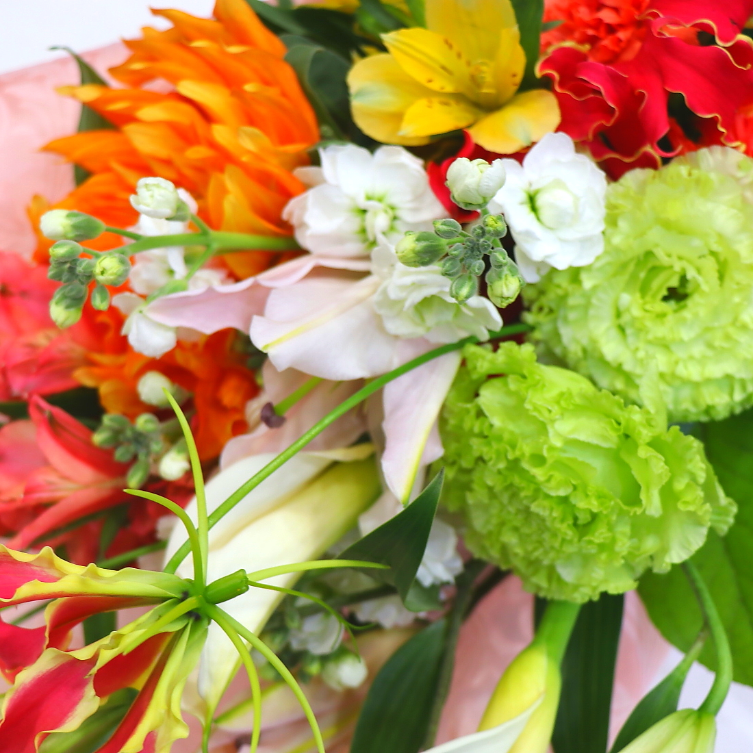花材: メイン ユリ、アルストロメリア、カーネーション、ストックなど その他 春の小花、葉物類など