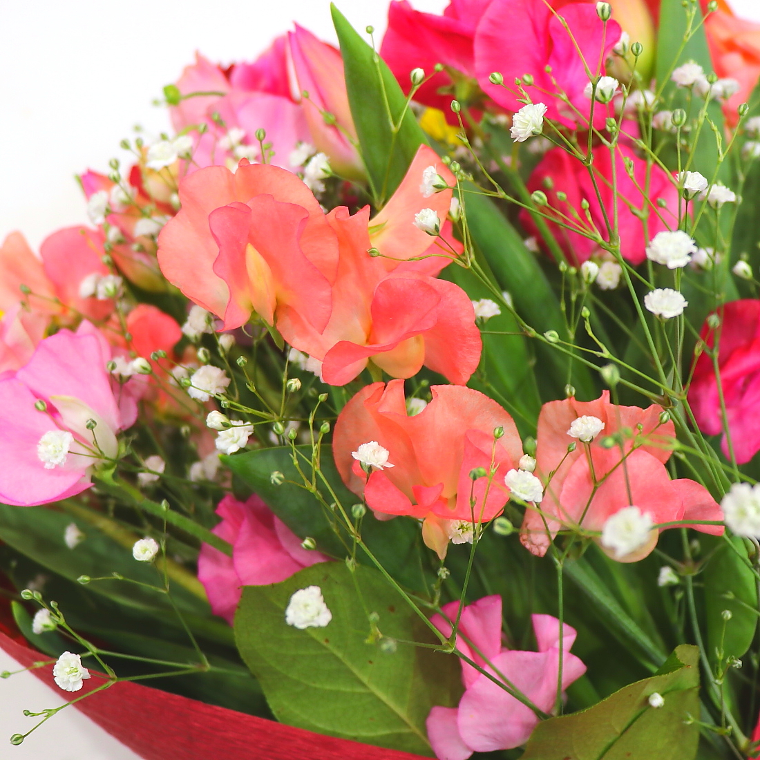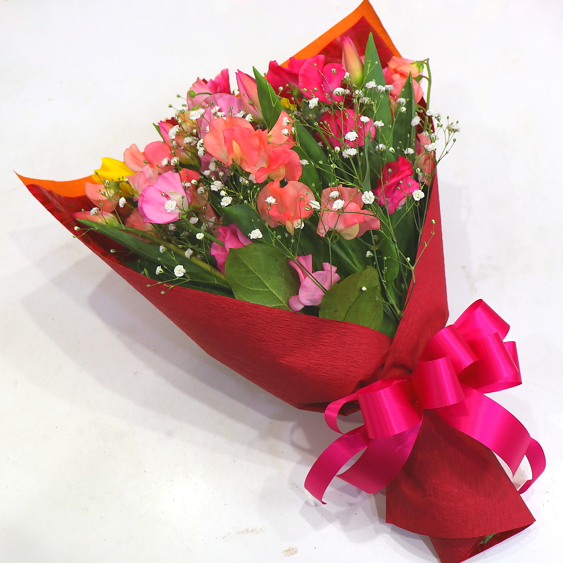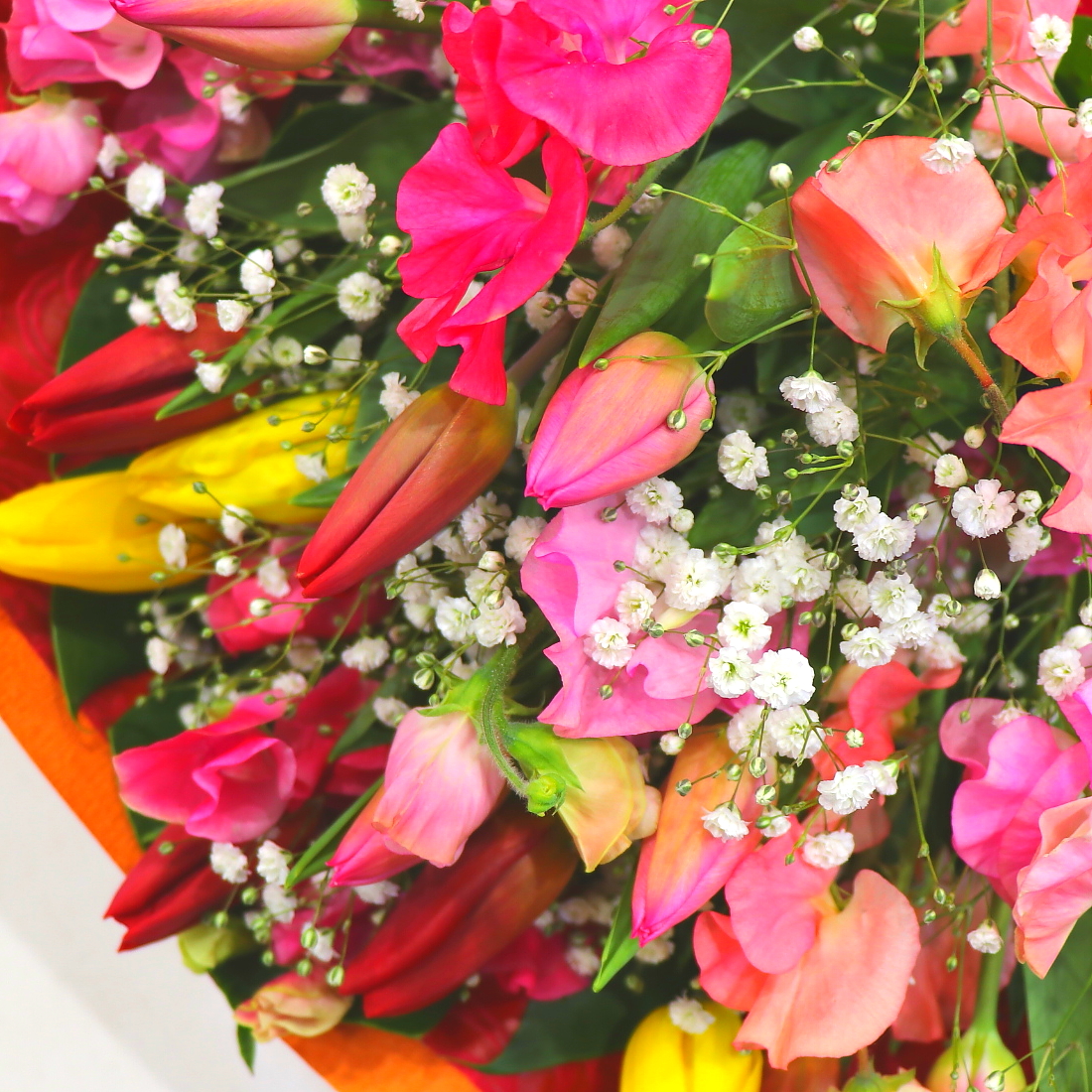 とっても華やかな花束です。春の季節を感じるチューリップやスイートピーを色とりどり入れて、かすみ草でボリューム感を演出しました。ラッピングも少し落ち着いたトーンでお花を引き立たせて上品にラッピング致します。また、持ちの良いお花を使っておりますので花持ちも良いでしょう。ご購入されたお客様から高い評価を頂いております。静岡県長泉町から日本全国【真心】込めてお届けいたします。さまざまなご用途に贈る贈り物としてオススメです。大切な方へ贈るフラワーギフトやプレゼントなら「花樹園オンラインドットコム」に是非、お任せ下さいませ。