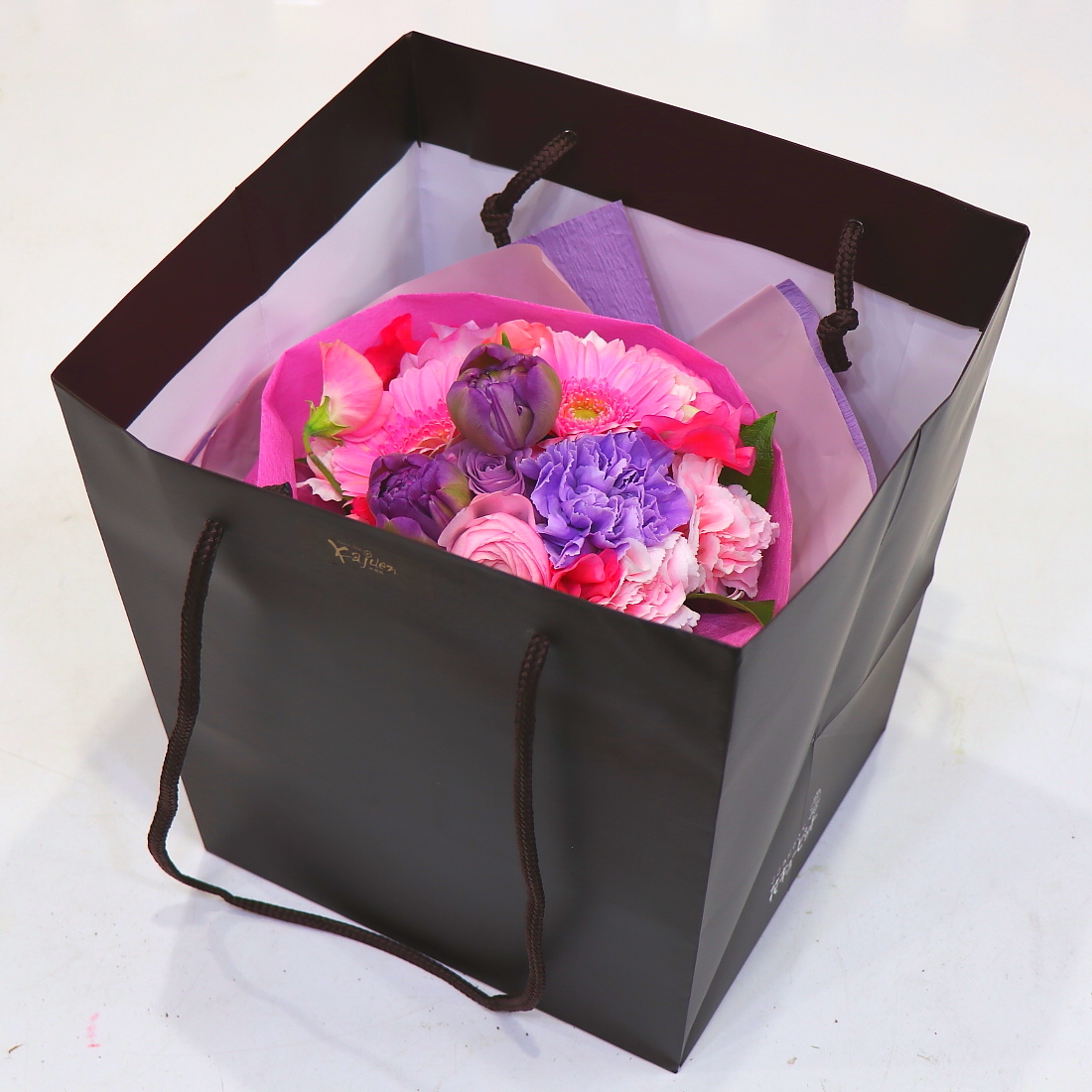 そのまま飾れる花束。ピンク&パープル系の新色です。春の贈り物にオススメですよ。【15時迄のご注文で翌日届きます】※こちらの商品についてのご相談、ご質問等ございましたら(メール)または(お電話)にて承ります。