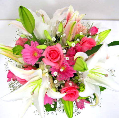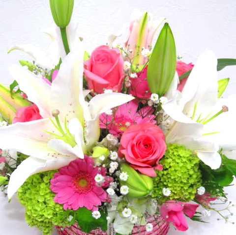 花材: メイン ユリ、バラ、ガーベラ、カーネーションなど その他 かすみ草、葉物類など
