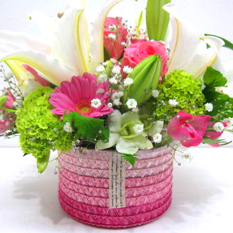 ピンクのグラデーションがとっても素敵なボリューム感のあるアレンジメントです。【15時迄のご注文で翌日届きます】※こちらの商品についてのご相談、ご質問等ございましたら(メール)または(お電話)にて承ります。