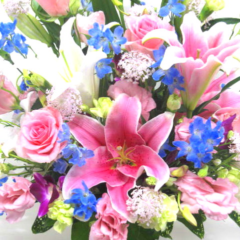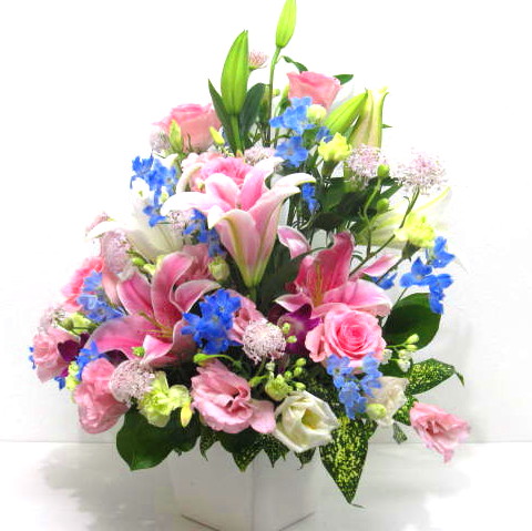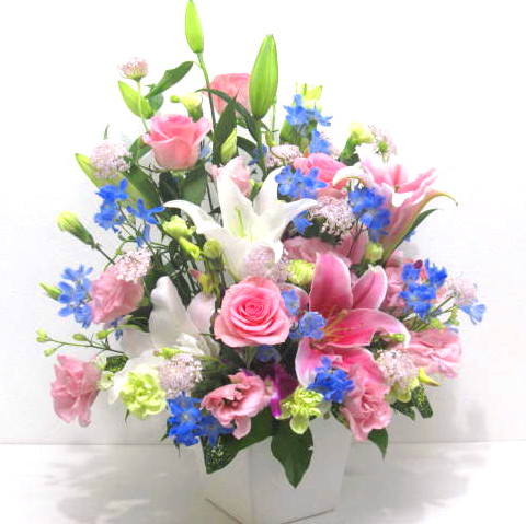 色とりどりのお花を入れ明るく、ユリやバラをいれ華やかにボリューム感を演出。当店ではお客様の想い大切に【こころを込めて】お作りいたします。静岡県長泉町から手渡しお届けまたは宅急便で全国にお届けします。是非、さまざまな贈り物に。