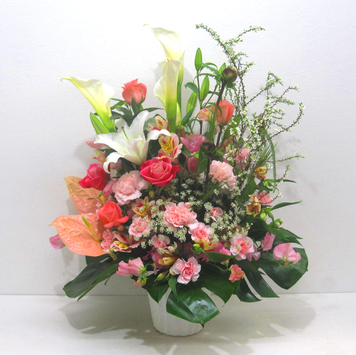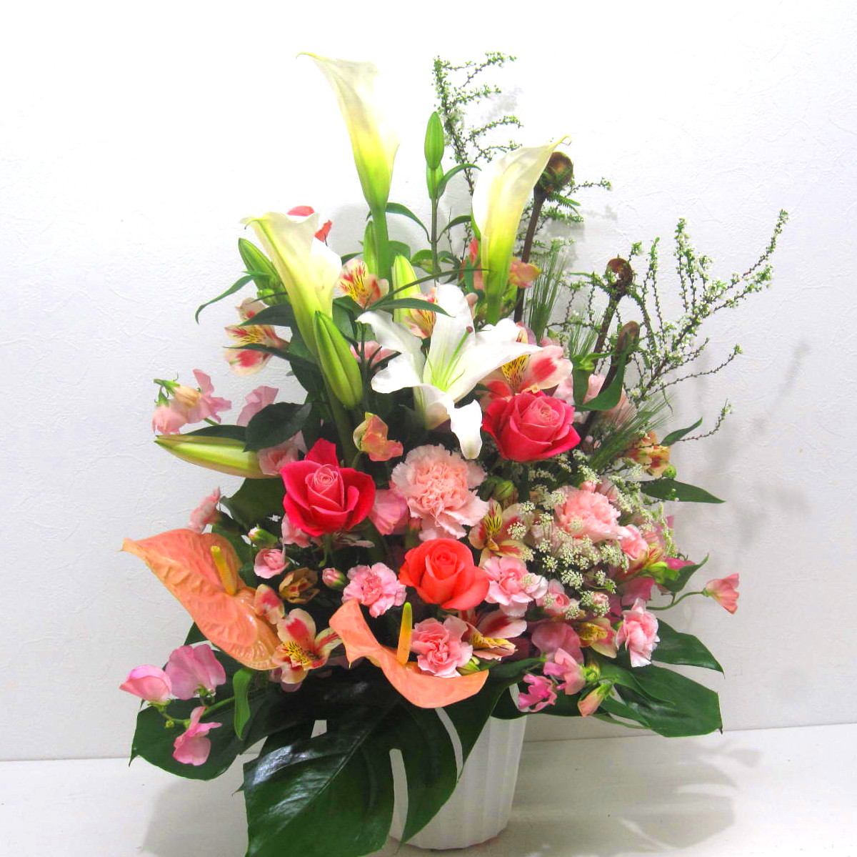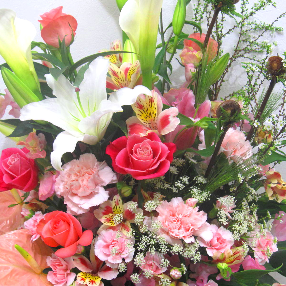 花材: メイン ユリ、バラ、カーネーション、蘭系のお花など その他 葉物類など