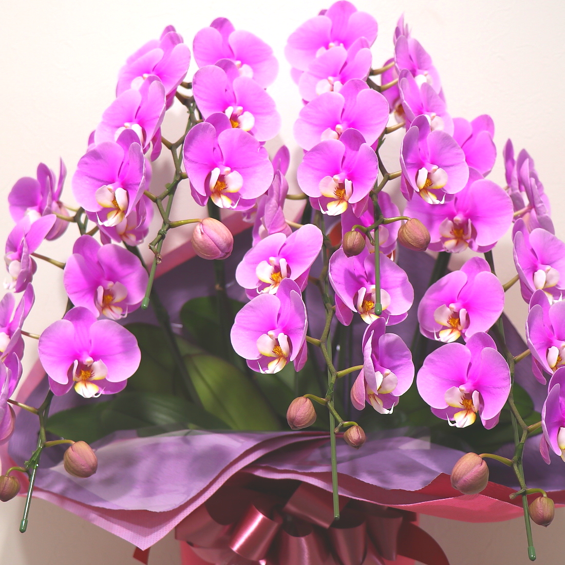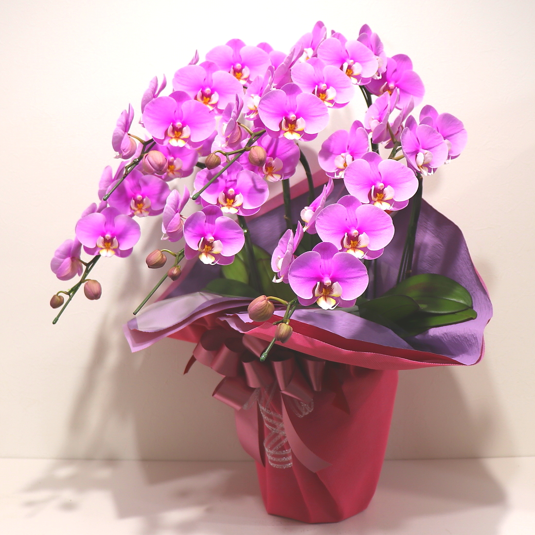 ピンクの上品な花びらが美しい胡蝶蘭(ソーゴアンナ)です。5本立ちの華やかなタイプとなります。いつもとは違う特別な贈り物にいかがでしょうか。花持ちも良く、だいたい2ヵ月~3ヵ月くらい鑑賞できますよ。静岡県長泉町から日本全国【真心】込めてお届けいたします。さまざまなご用途に贈る贈り物としてオススメです。大切な方へ贈るフラワーギフトやプレゼントなら「花樹園オンラインドットコム」に是非、お任せ下さいませ。