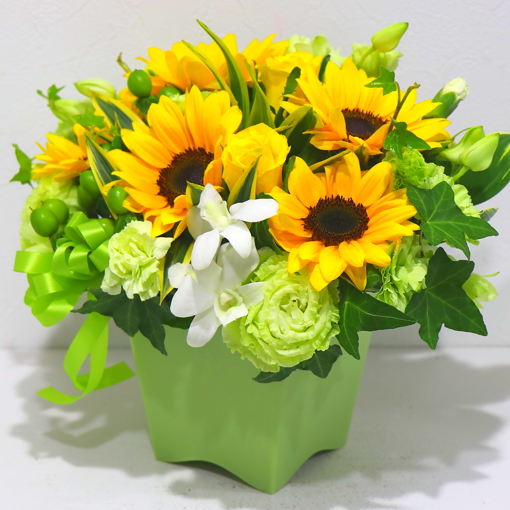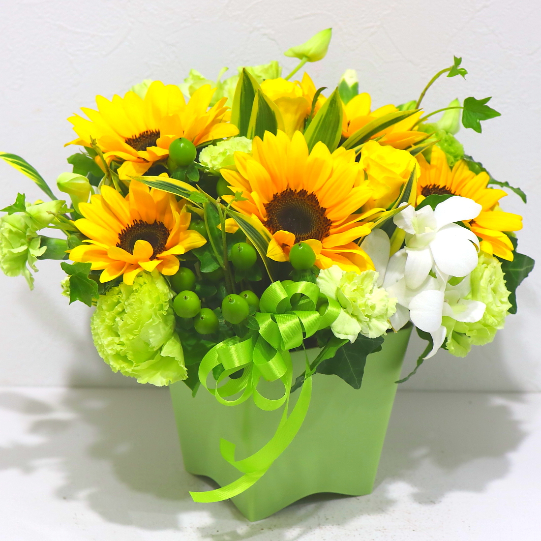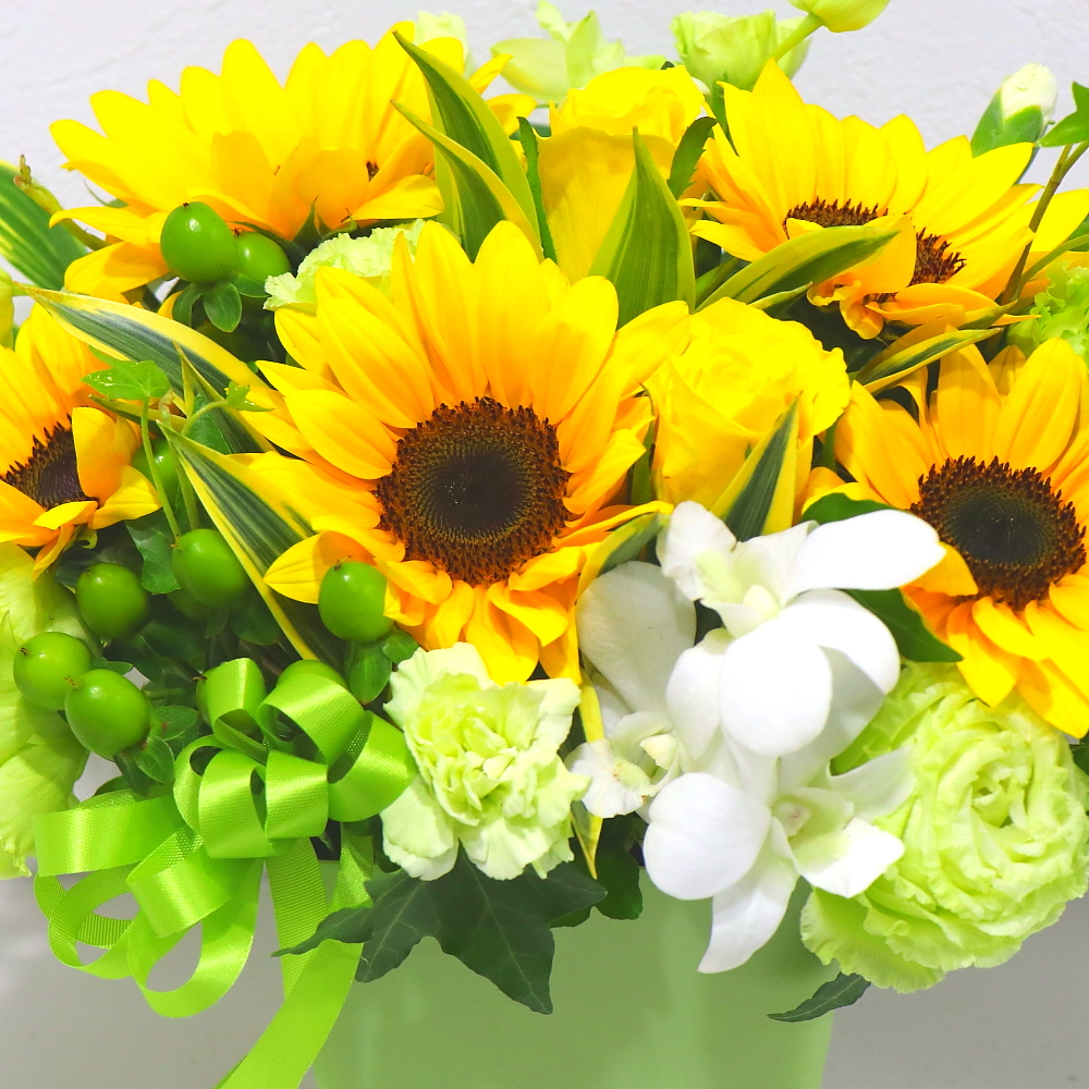 主役のヒマワリが引き立つとっても素敵なアレンジメントです。暑い夏をフレッシュにしてくれそうな絶妙な色合いがきっと喜ばれますよ!また、持ちの良いお花を中心に使っておりますので花持ちも良いでしょう。ご購入されたお客様から高い評価を頂いております。静岡県長泉町から日本全国【真心】込めてお届けいたします。さまざまなご用途に贈る贈り物としてオススメです。大切な方へ贈るフラワーギフトやプレゼントなら「花樹園オンラインドットコム」に是非、お任せ下さいませ。