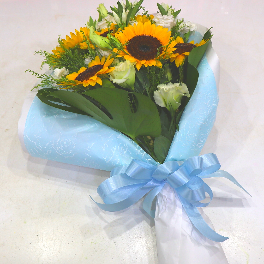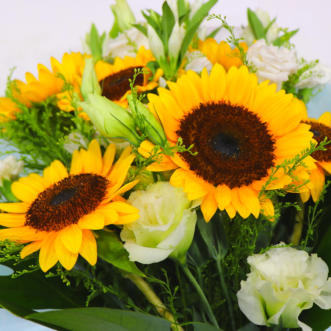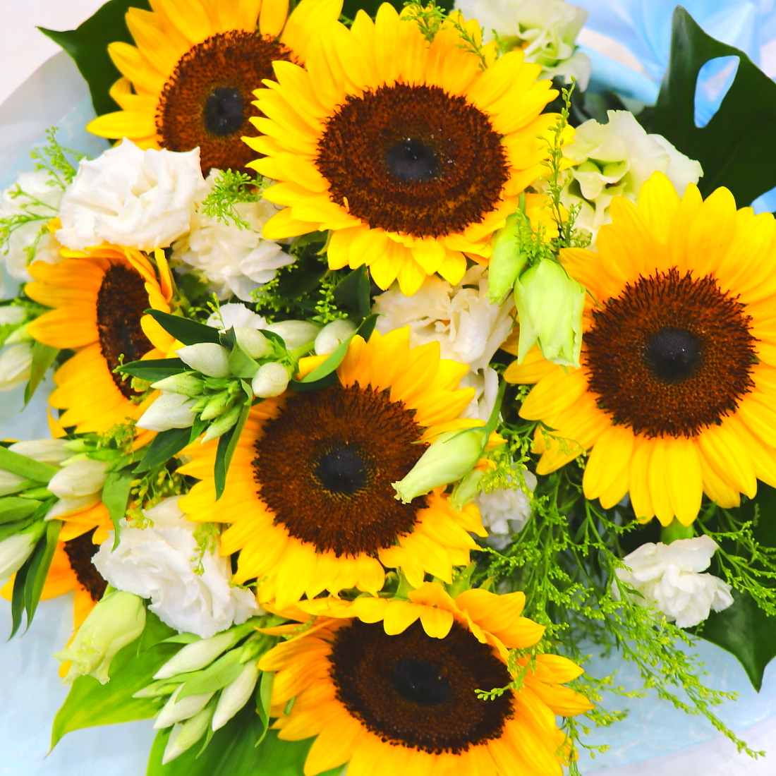 ヒマワリみたいに明るかった故人様へ…この時期にピッタリなヒマワリを中心にまとめた花束。【15時迄のご注文で翌日届きます】※こちらの商品についてのご相談、ご質問等ございましたら(メール)または(お電話)にて承ります。