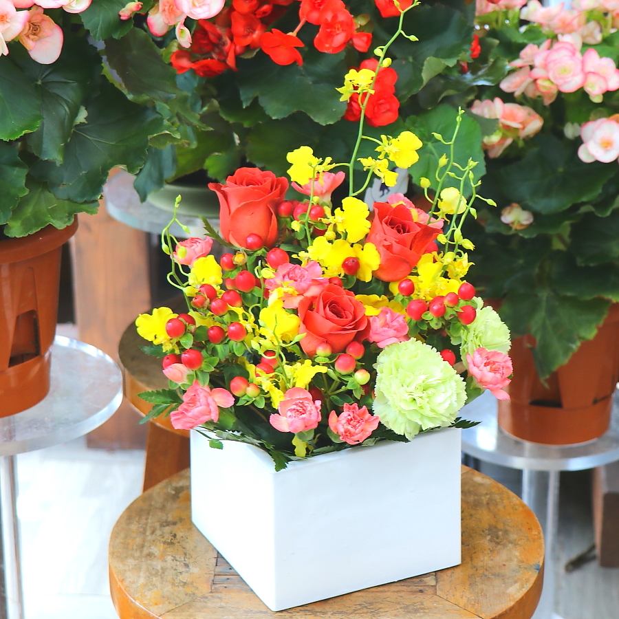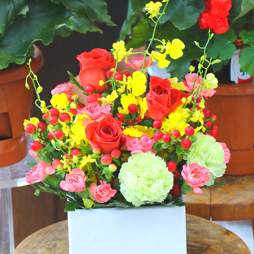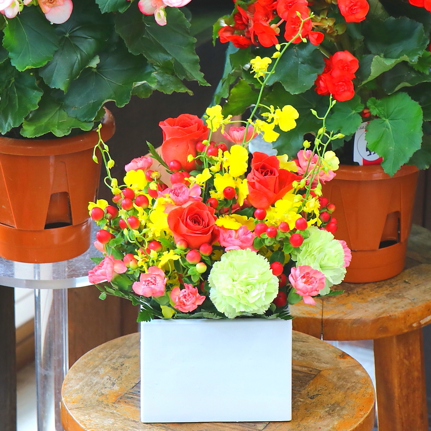 この時期にふさわしい秋色のアレンジメントです。白いセンスの良い四角い器にバラやカーネーション、オンシジュームなどの華やかなお花を入れて赤い実物をアクセントに秋らしくお作りします。秋の実る想いをきっと伝えてくれますよ。また、ご購入されたお客様から高い評価を頂いております。静岡県長泉町から日本全国【真心】込めてお届けいたします。さまざまなご用途に贈る贈り物としてオススメです。大切な方へ贈るフラワーギフトやプレゼントなら「花樹園オンラインドットコム」に是非、お任せ下さいませ。