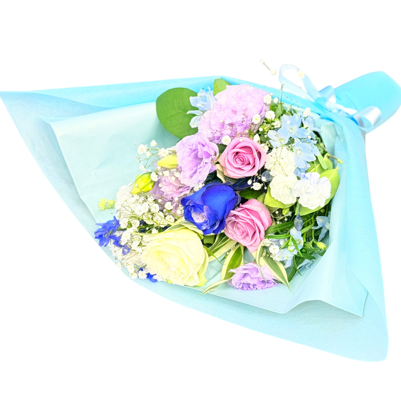 水色のラッピングが心を癒すブルー&パープル系の花束