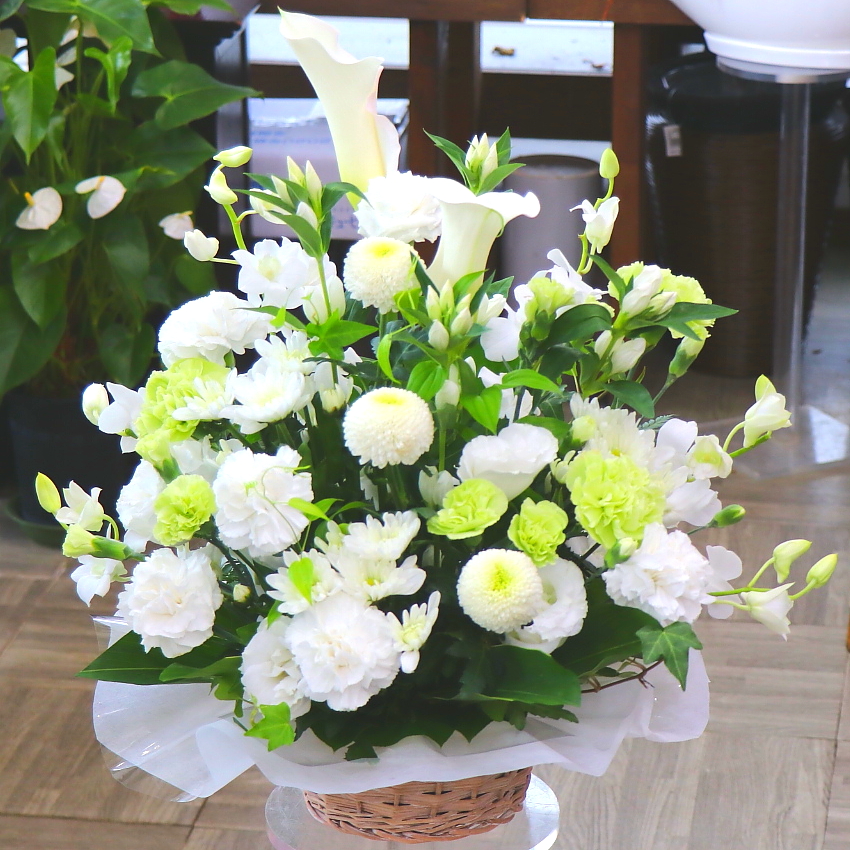 故人を弔いご家族やご遺族へのお気持ちが伝わる白&グリーン系のお悔やみアレンジメント