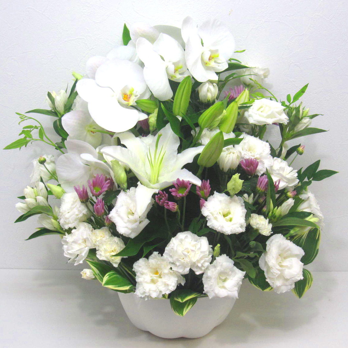 胡蝶蘭と白ユリを入れた淡い上品なアレンジメント