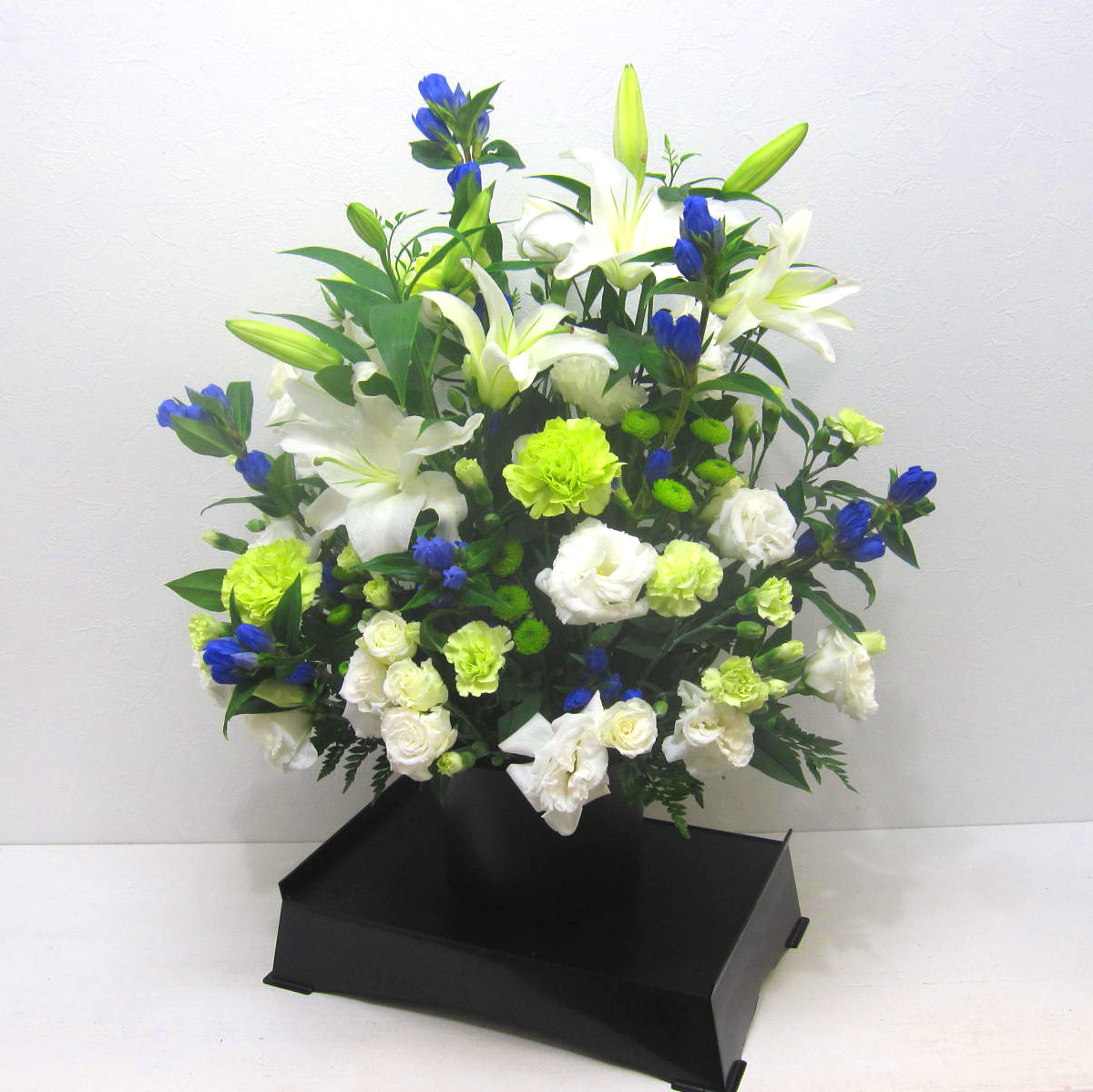 《春のお供え》白系中心の淡いブルーとピンク色を入れたアレンジメント