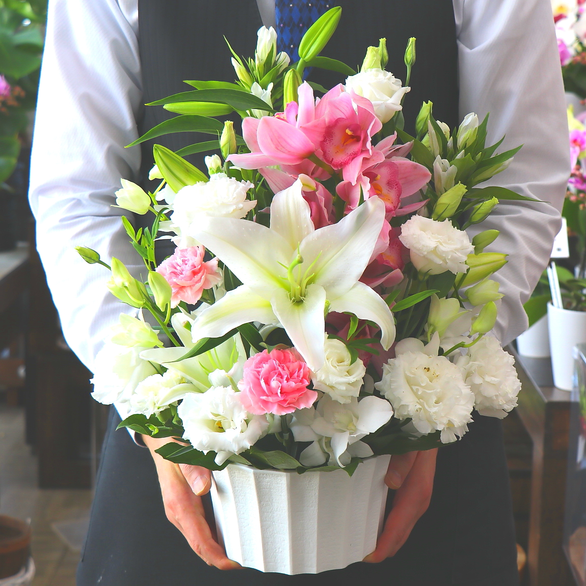 《春のお供え》ホワイト系でまとめたアレンジメント