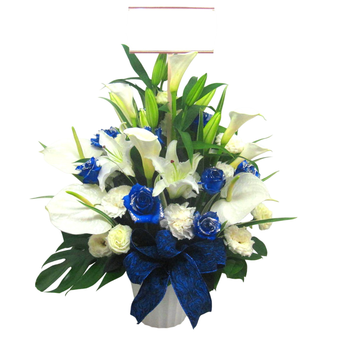 【オリジナル染色】キラキラ青いバラ入りの白&ブルー系の豪華なアレンジメント