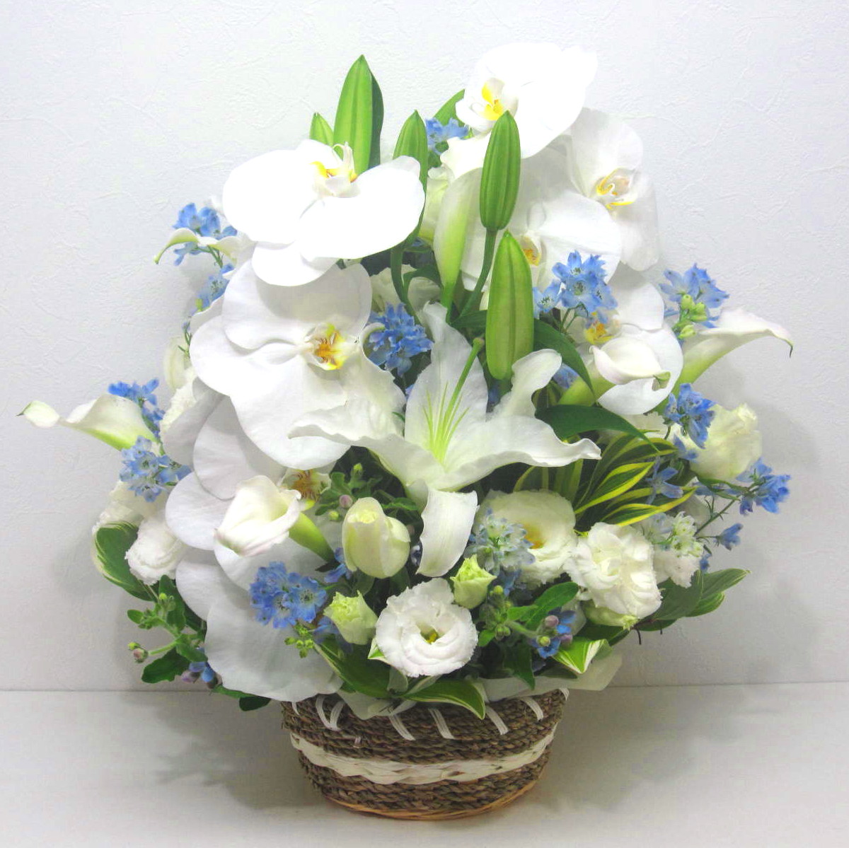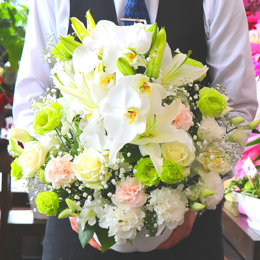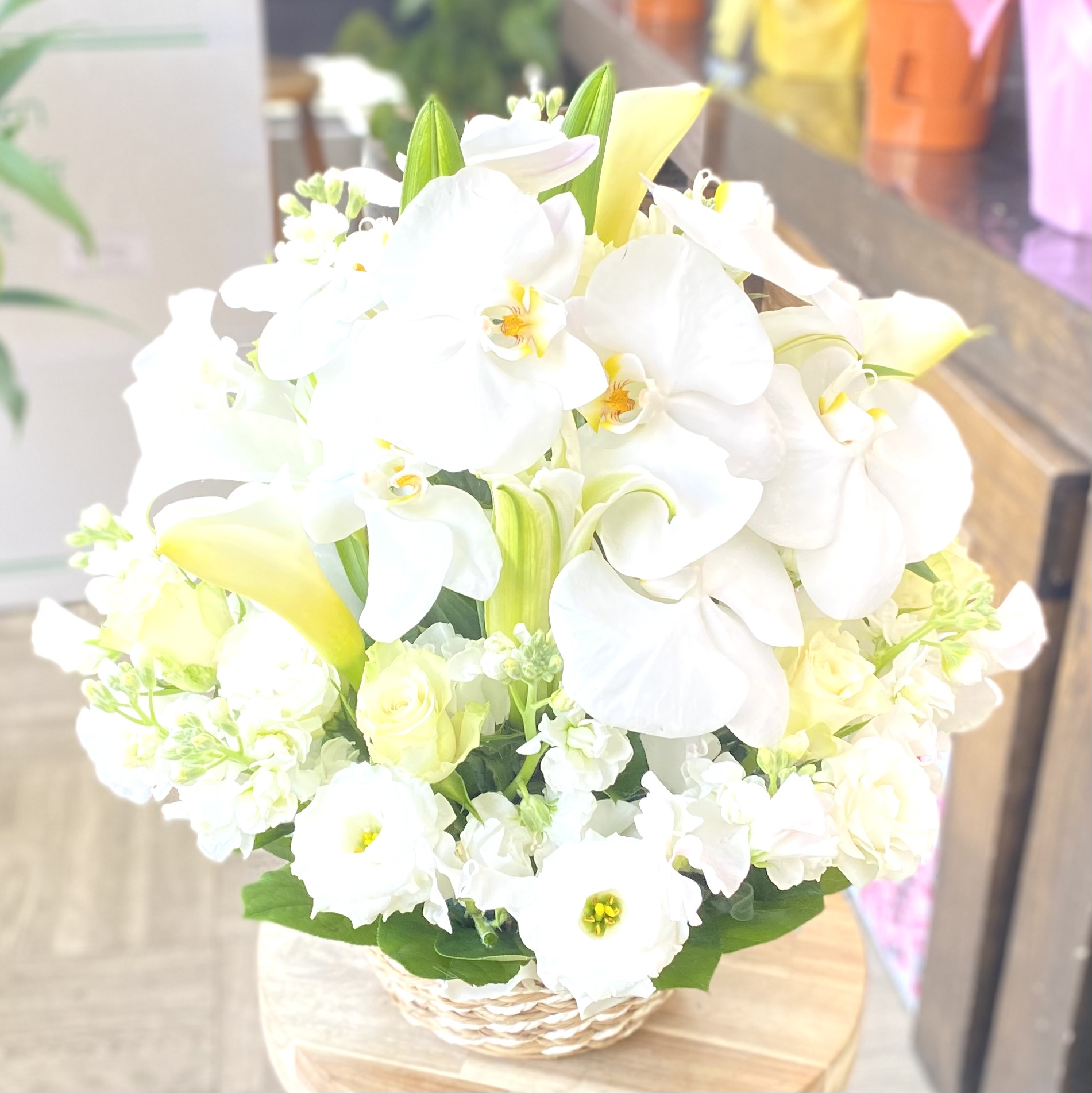 胡蝶蘭と白いユリを入れた白系主体のお悔やみアレンジメント