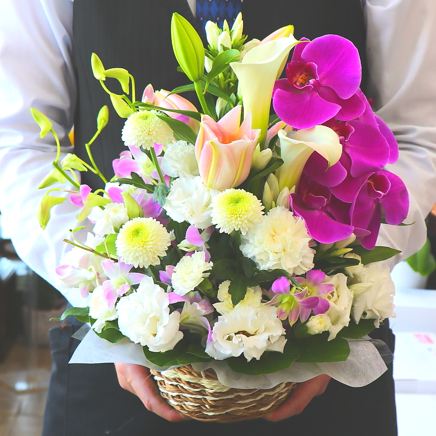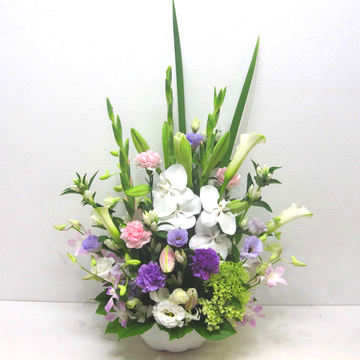 カサブランカと胡蝶蘭の洋花中心のお悔やみアレンジメント