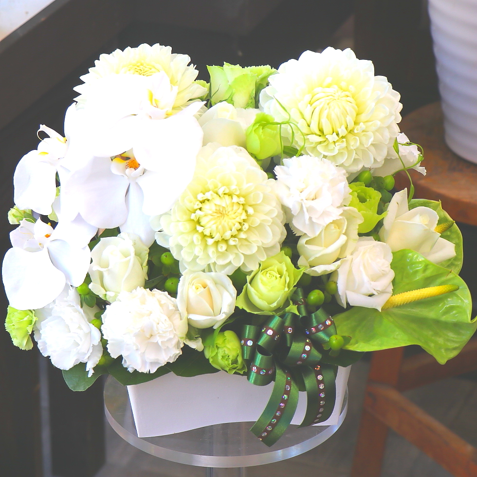 白&グリーン系のふんわり清楚で上品なアレンジメント