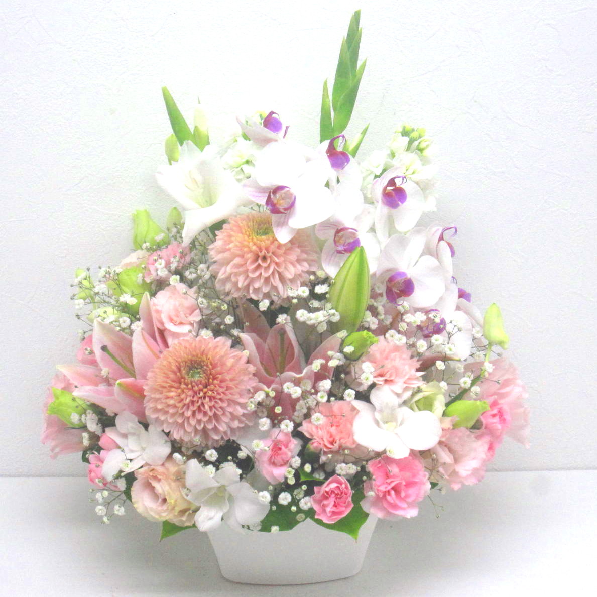 《春のお供え》コチョウランを入れたこじんまりと上品なアレンジメント