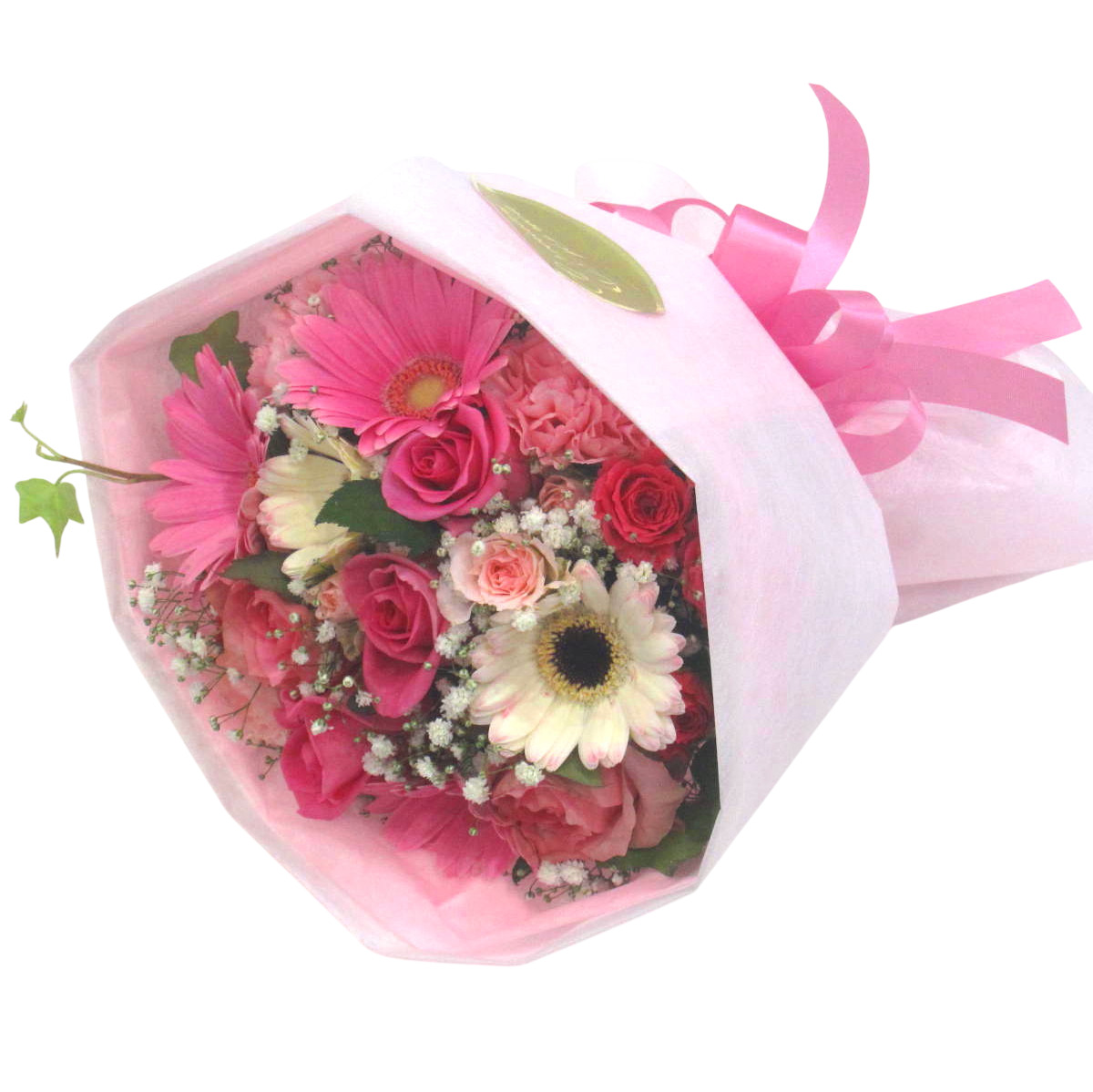赤いミニバラとピンクガーベラ主体のかすみ草を入れた花束