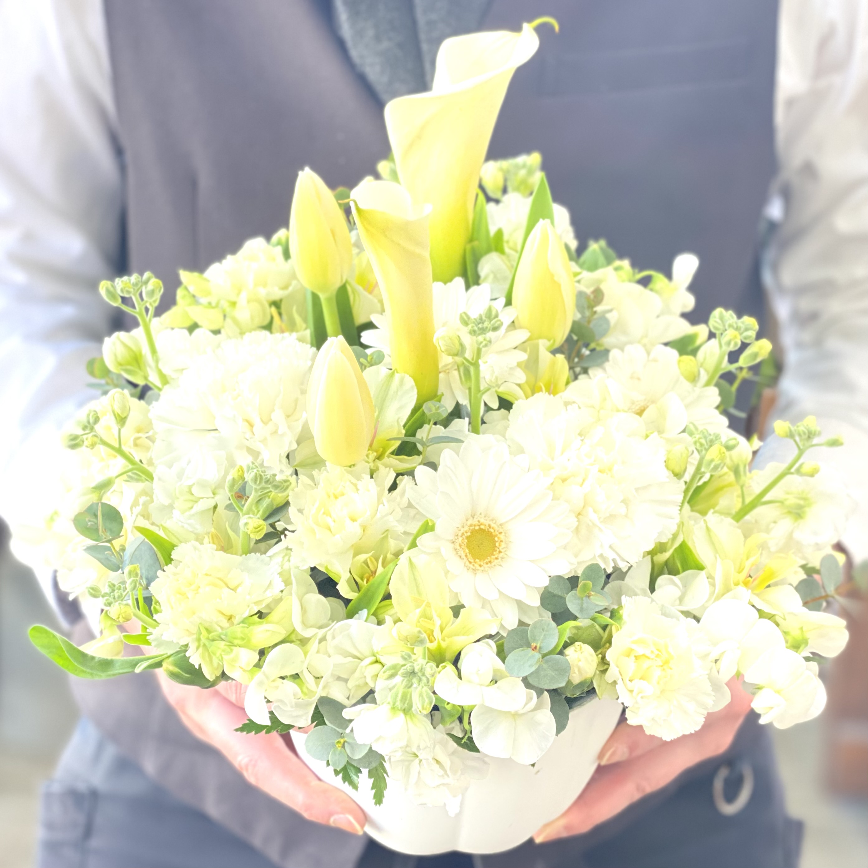 《春のお供え》ホワイト系の清楚な雰囲気のアレンジメント