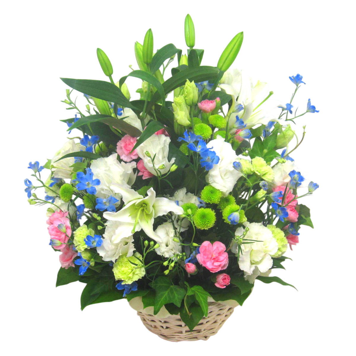 白&ブルー系のボリューム感のあるメモリアルアレンジメント