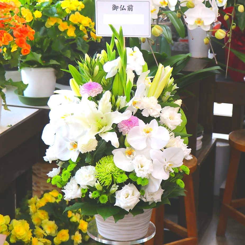 哀悼の意を込めた白上がりのお供えアレンジメント