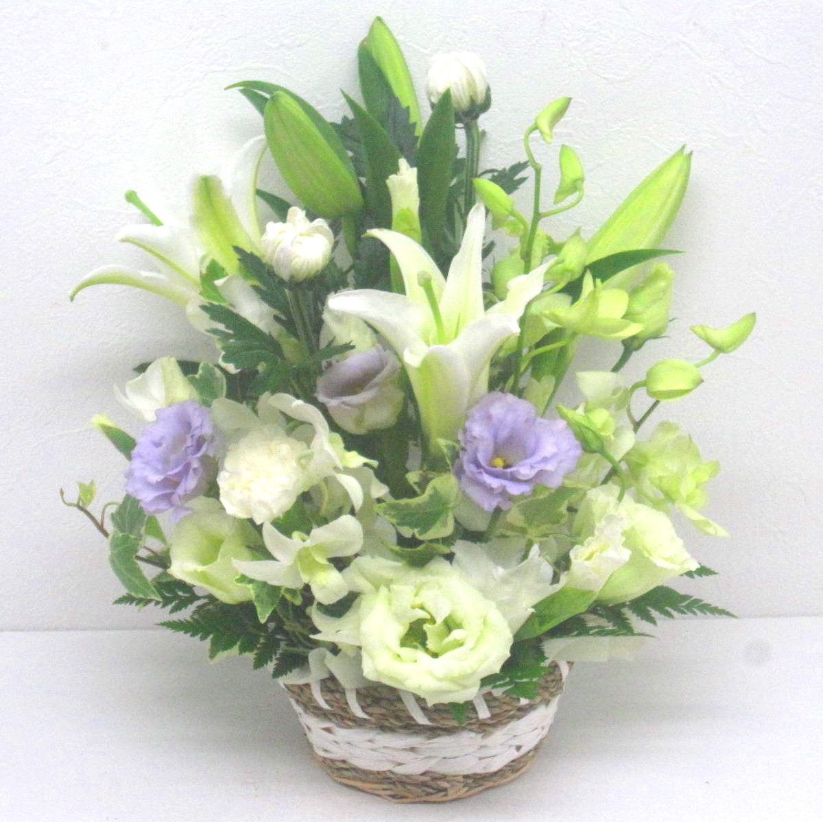 《春のお供え》ユリを入れた白系主体のアレンジメント