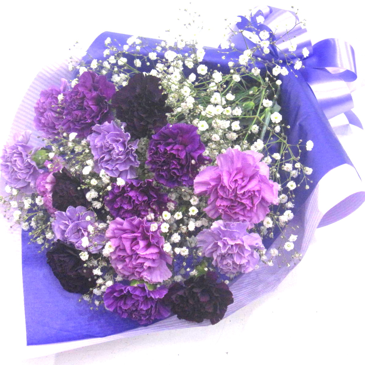 青いバラを入れたブルー系濃淡の華やかな花束