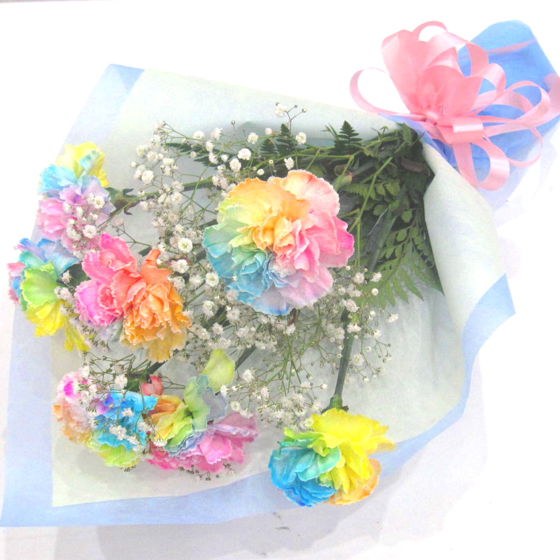 《母の日》パステルレインボーカーネーションとかすみ草のボリューム感のある花束