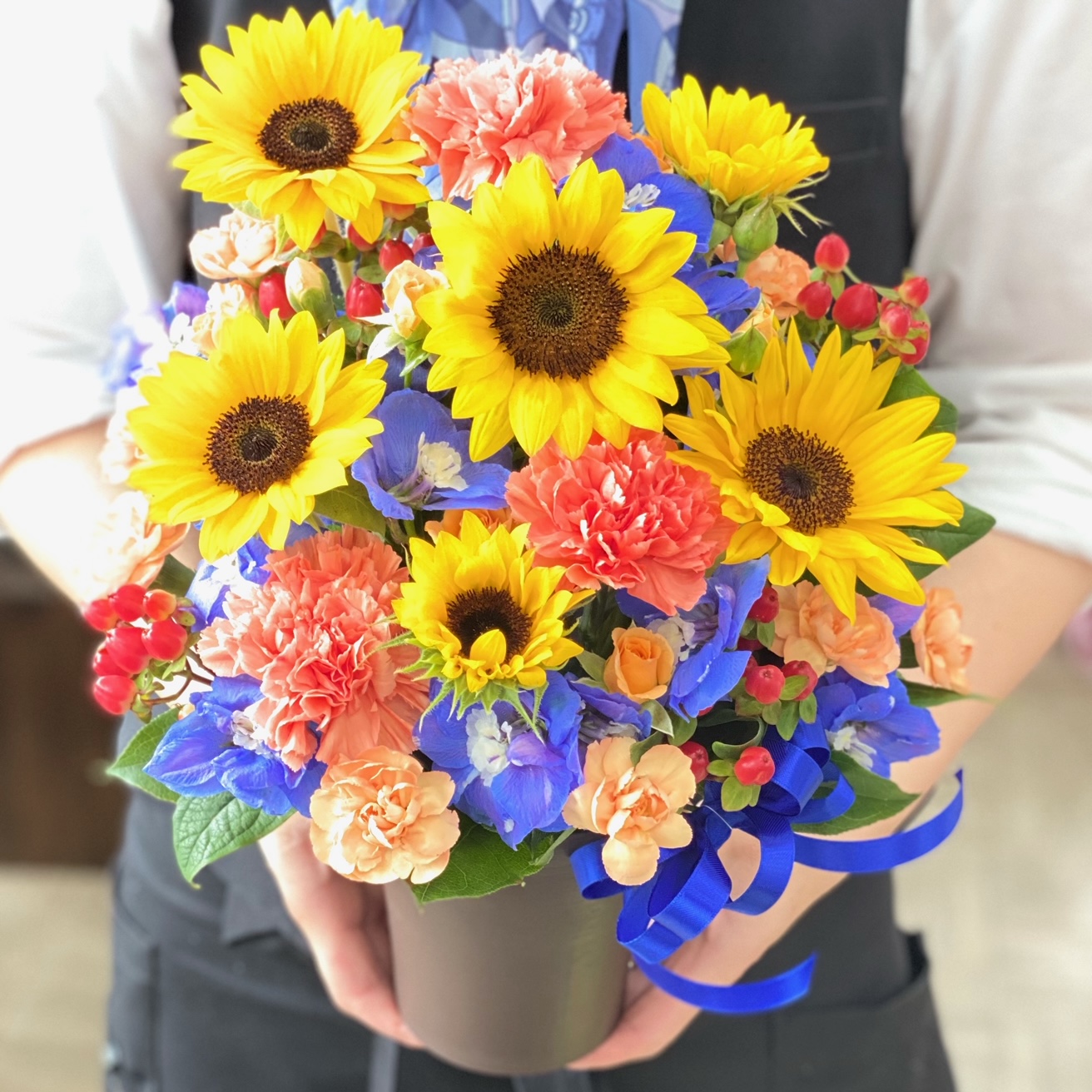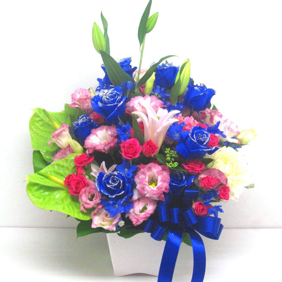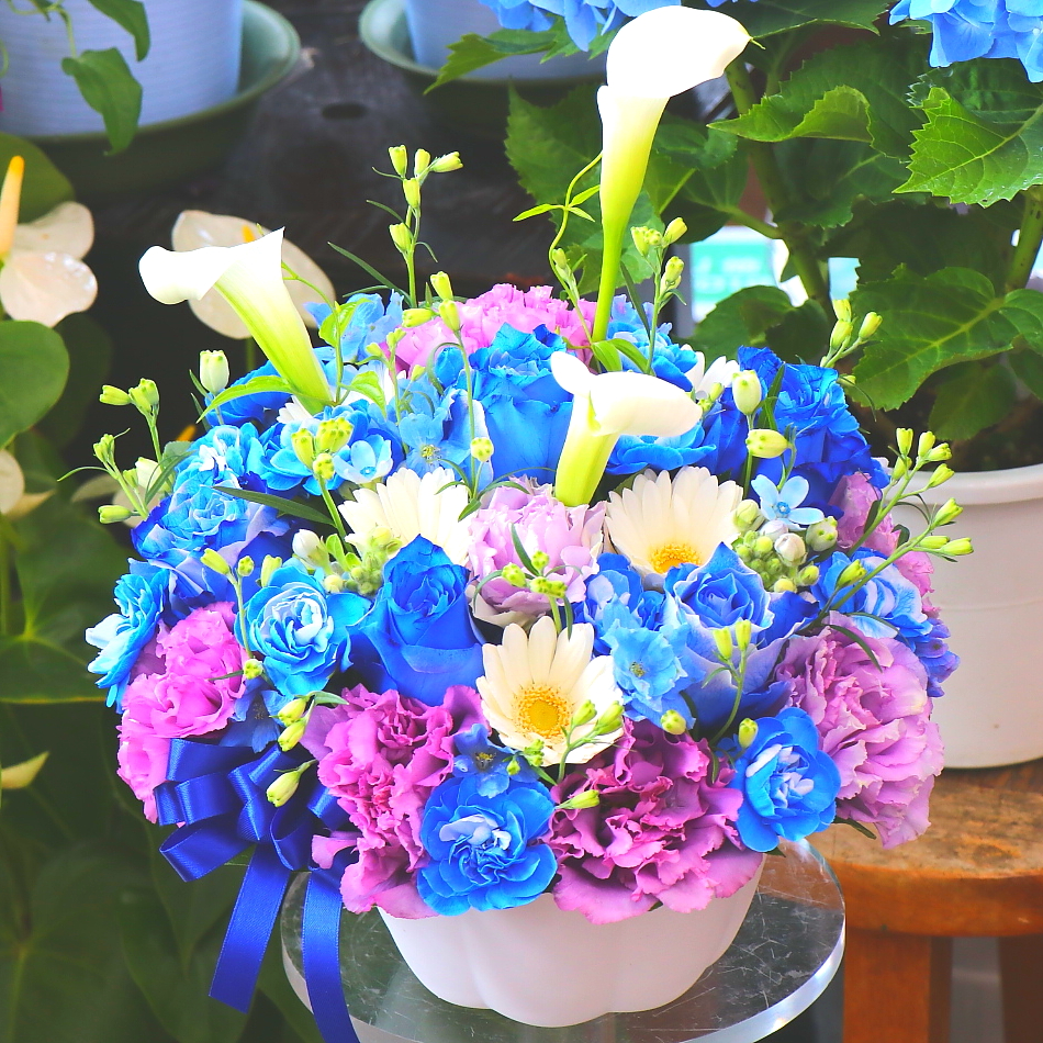 【オリジナル染色】青いバラを入れた華やかで上品なアレンジメント