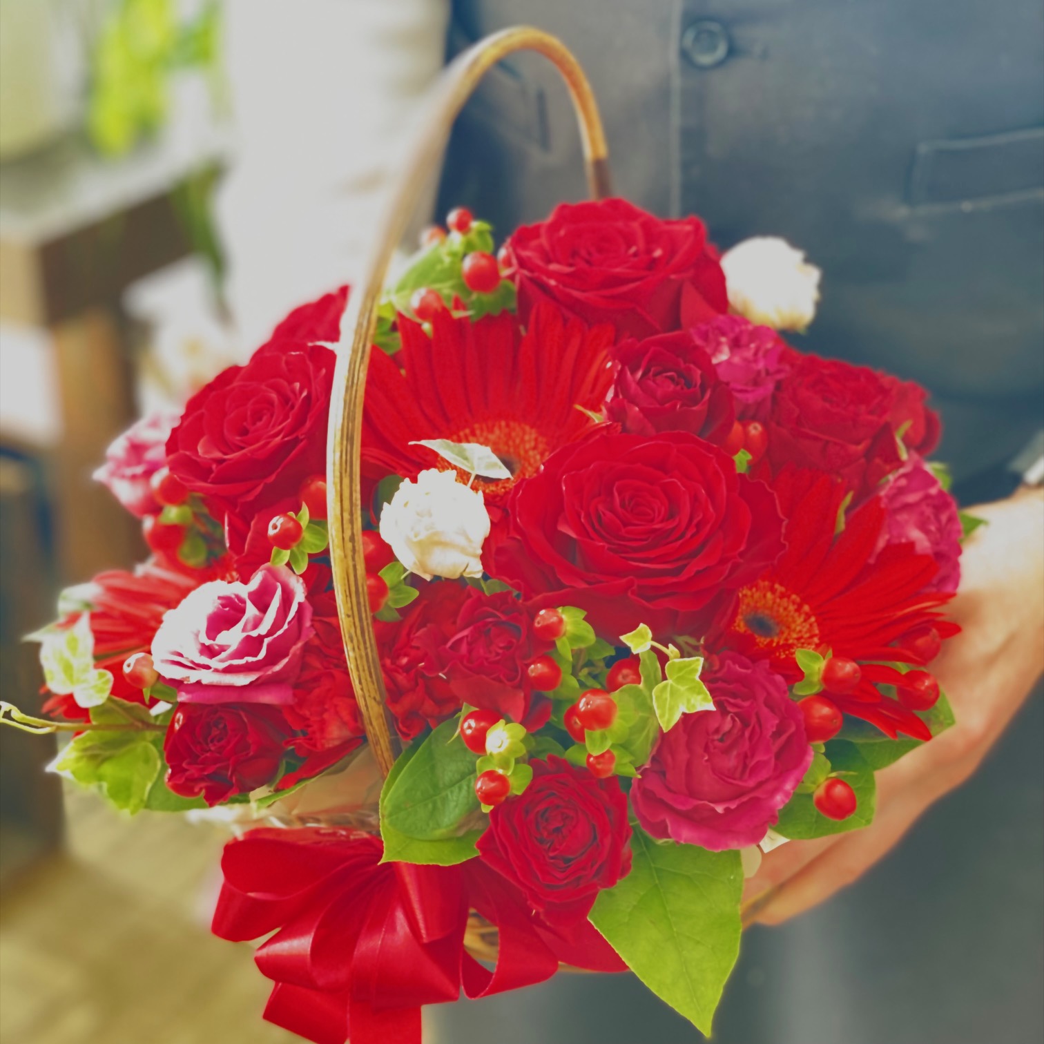 想いが伝わる【赤いバラとかすみ草のアレンジメント】