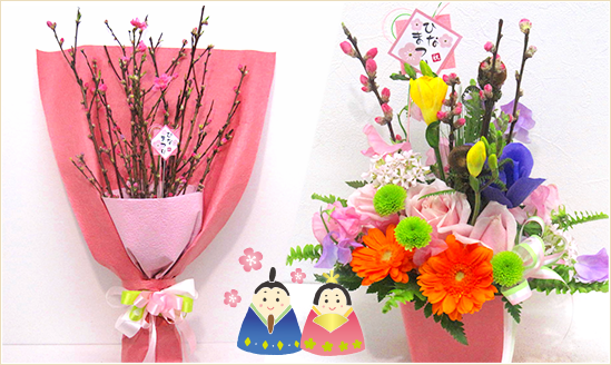 3月3日はひなまつり。女の子の健やかな成長を祈る季節行事です。「桃の花」の入った花束やアレンジメントが人気です。 -