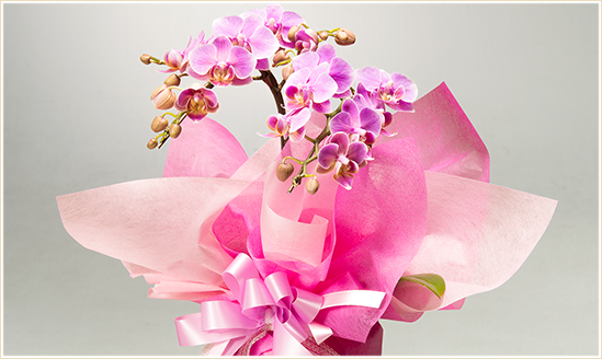 みんなの前で贈るなら春の明るい華やかな花束はいかがですか。また、個人から贈る場合やご自宅へ贈る場合は、花瓶不要の持ち運びが楽なそのまま飾れるアレンジメントや小ぶりな胡蝶蘭の鉢物がオススメです。 -
