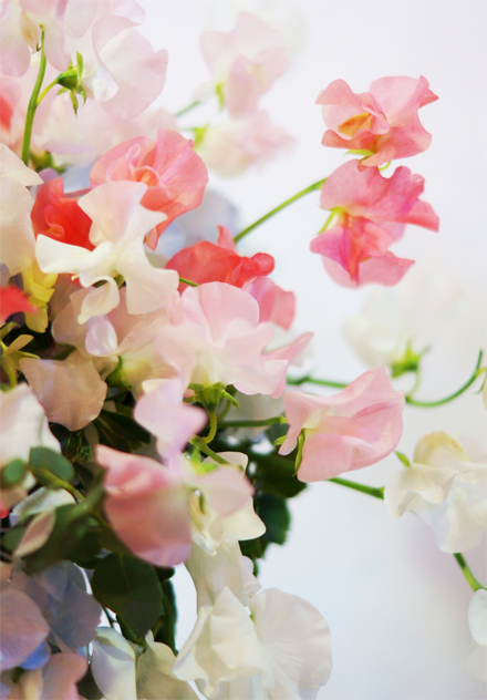 「スイートピー(sweet pea)=甘い香りの豆」と花の持つ特有な香りから命名されました。